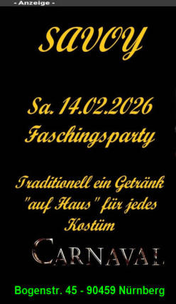 Endlich wieder Fasching auch in der Nürnberger Südstadt: Wirt Peter Liedl wird mit seiner Savoy Bar (Bogenstr. 45) den Fasching hochleben lassen! +++ Am Samstag den 14. Februar 2026 ab 19:00 Uhr lockt traditionell die große „Faschingsparty“! Peter freut sich auf viele kreative Kostüme und Masken! Alle, die in einem Kostüm erscheinen, erhalten ein Freigetränk. Also, seid ideenreich, kreativ und bunt! +++ Der Nürnberger Faschingszug endet zwar schon am Sonntag-Nachmittag den 15. Februar 2026, aber ab 19:00 Uhr hat Peter das Savoy ebenfalls geöffnet! +++ Am Montag 16. Februar 2026 heißt es ab 19:00 Uhr „RosenMontagFasching“. Auf in die Savoy Bar! +++ Hinweis: Dienstag und Mittwoch ist das Savoy geschlossen!