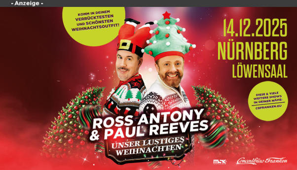 Eines von Deutschlands bekanntesten Männerpaaren kommt nach Nürnberg! Am Sonntag den 14. Dezember 2025 um 20:00 Uhr gastieren Ross Antony & Paul Reeves mit ihrer Show „Unser lustiges Weihnachten“ im Löwensaal Nürnberg (Schmausen-buckstr. 166) beim Tiergarten. Nach dem großen Erfolg der ersten Tour im letzten Jahr sind die beiden Künstler zurück, um Weihnachten noch lustiger, bunter und unvergesslicher zu machen! Ross Antony, der gute Laune-Garant, und sein Mann Paul Reeves, der Opernsänger und kreative Kopf der Show, bieten ihrem Publikum ein außergewöhnliches Weihnachtserlebnis. Die Show vereint festliche Lieder, humorvolle Anekdoten und jede Menge interaktive Überraschungen, bei denen das Publikum immer mit einbezogen wird, hier wird gemeinsam gesungen, gelacht und gefeiert! In diesem Jahr haben sie ein ganz besonderes Motto: Kommt in euren verrücktesten und schönsten Weihnachtsoutfits! Weihnachten darf noch kreativer gefeiert werden, und je ausgefallener und festlicher, desto besser! Ross und Paul können es kaum erwarten, ein Publikum in den verschiedensten Weihnachtskreationen zu sehen und die Bühne mit noch mehr Glanz und Glitter zu füllen. VVK: Karten ab 44,90 € +++ Kartenvorverkauf über die Webseite vom Concertbüro Franken +++