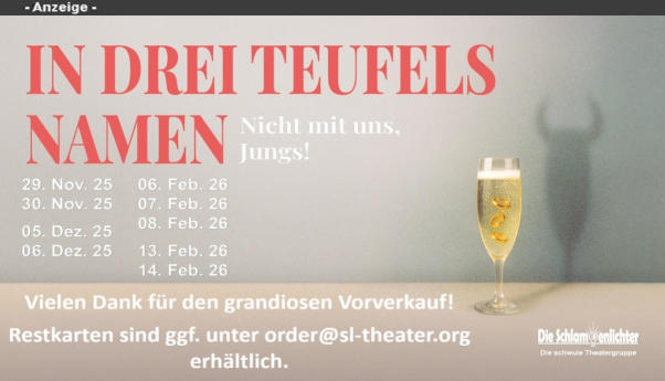 Das schwule Theater Nürnberg - Die Schlampenlichter – präsentiert in der neuen Saison das Stück „In drei Teufels Namen – Nicht mit uns, Jungs! “. Am Samstag den 29. (Premiere) & Sonntag den 30. November sowie am Freitag den 05. & Samstag 06. Dezember 2025 jeweils um 19:30 Uhr im Hubertussaal (Dianastr. 28) in der Nähe des Dianaplatzes im Nürnberger Stadtteil Gibitzenhof. Zum ersten Mal sind seit sieben Wochen vor der Premiere alle Vorstellungen komplett ausverkauft! Eventuelle Restkarten können per E-Mail bei den Schlampenlichtern angefragt werden. Mit welcher Vorlage die Schlampenlichter die Zuschauer verführen, verraten sie erfahrungsgemäß nicht so gern im Vorfeld. Darum lasst euch überraschen! Nur so viel zum Stück: Sie waren beste Freunde in Studentenzeiten. Doch dann verloren sie sich aus den Augen und führten jeder für sich ein scheinbar perfektes Leben, bis ihre Ex-Partner ihnen den Boden unter den Füßen wegzogen. Jetzt, im besten Alter und durch das Schicksal wieder vereint, zeigen sie, dass es im Hochsommer des Lebens heiß hergeht und dass Rache ein Gericht ist, das man am liebsten kalt serviert. Bist du bereit für eine wilde Achterbahnfahrt der Gefühle? Wie immer verqueert die Theatertruppe bekannte Geschichten, schreibt neue Reim- und Singtexte auf fränkisch. Es entsteht eine köstliche Mischung aus vielen Zweideutigkeiten live auf der Bühne. Weitere Infos auf der Webseite der Schlampenlichter. +++ Weitere Termine sind im nächsten Jahr von 06. bis 08. sowie am 13. & 14. Februar 2026. +++ Update: Alle Vorstellungen sind ausverkauft! +++