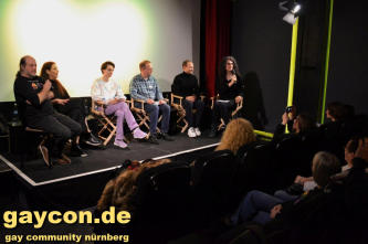 Polit Talk im Casablanca Filmkunsttheater: v.l. Klaus Pölloth, Thia Bauer, Matti Stockmann, Thorben Starke, Theo Deinlein und Tiffany (Foto: GAYCON.DE)