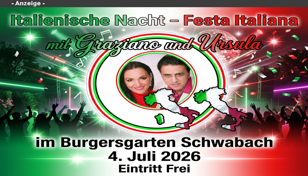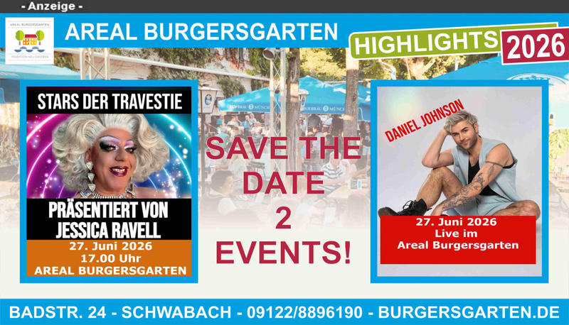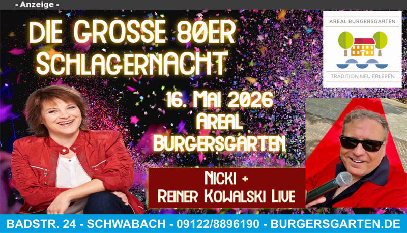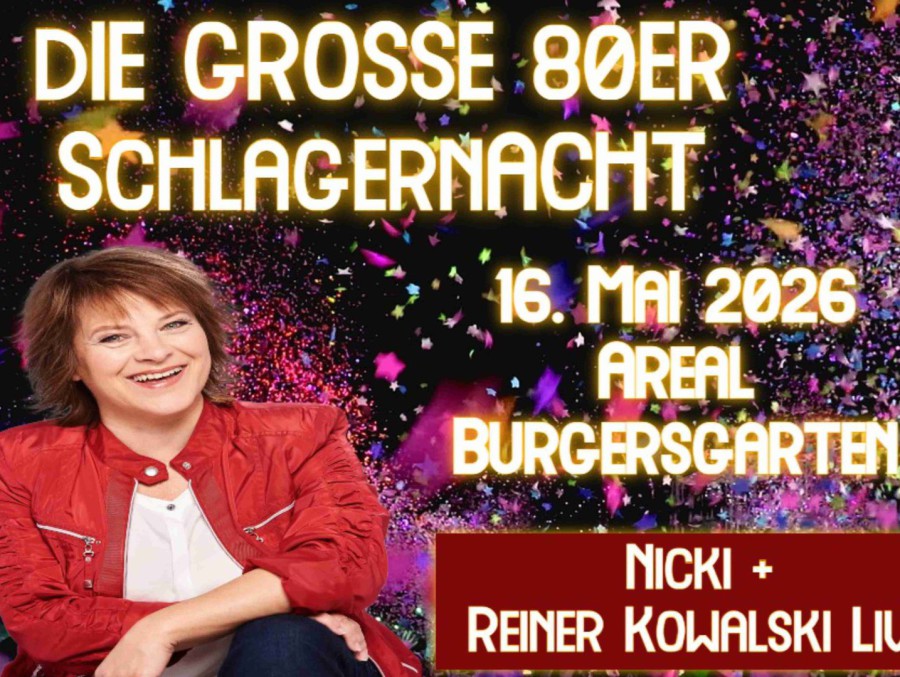 Vorschau Schwabach: Am Samstag den 16. Mai 2026 findet die Open Air „80er Schlagernacht mit Nicki und Reiner Kowalski“ im Areal Burgersgarten in Schwabach (Badstr. 24) statt. An diesem Abend gastiert eine wahre Ikone des deutschen Schlagers - die bezaubernde Nicki - in der Goldschlägerstadt. Seit den 1980er Jahren verzaubert sie ihr Publikum mit Charme, Natürlichkeit und jeder Menge Herzblut. Ihre Hits wie „Bayrisches Cowgirl“, „Wenn i mit dir tanz“, „I bin a bayrisches Madl“ oder „Wegen Dir“ sind längst Kult. Gemeinsam mit Reiner Kowalski wird Nicki an diesem Abend für ein unvergessliches Musikerlebnis sorgen. +++ Update: Es gibt nur noch sehr wenige Karten! +++ Nutzt den Kartenvorverkauf, um so schnell wie möglich die letzten Tickets zu sichern, um dieses Event nicht zu verpassen! VVK 23,- Euro / AK 25,- Euro. Kartenvorverkauf über die Webseite vom Areal Burgersgarten Schwabach