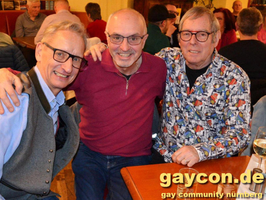 Seit etwa fünf Jahren ist es Tradition, dass sich die queere Community & Friends im Restaurant Literaturhaus (Luitpoldstr. 6) gemeinsam zum Grünkohl-Essen trifft. In diesem Jahr am vierten Februar-Montag, mit 50 Teilnehmenden, inzwischen mit deutlich mehr Zuspruch! Das erste Grünkohl-Essen startete mit rund 20 Besuchenden, wie uns Bernd verraten hat. Das Wintergemüse ist mehr in Norddeutschland bekannt, aber inzwischen öffnen sich auch die Franken dafür. Ein schöner Abend mit bester Laune und guter Stimmung, sowie vielen Gesprächen untereinander. Im Mittelpunkt stand das Grünkohl-Wintergemüse mit Kartoffeln zu Schinken und geräucherter Wurst. Mit Nachschlagmöglichkeit für alle, die noch Platz im Magen hatten. Ergänzt mit einem feinen Dessert aus Vanille Eis, Sahne und einer Streuselschnitte. Bernd bedankte sich bei Organisator Bert Hogeweg mit einem Grünkohl-Tulpen-Blumenstrauß. Wir hielten den Abend mit einigen Impressionen fest. Inzwischen ist die Bildergalerie online