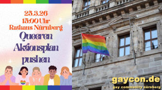 Am Mittwoch den 25. März 2026 um 15:00 Uhr findet die Öffentliche Stadtratssitzung zum Thema Aktionsplan „Queeres Nürnberg – Stark durch Vielfalt“ im Nürnberger Rathaus (Fünferplatz 2) statt. Im Großen Sitzungssaal geht es um den Beschluss des neuen Aktionsplans, der eine Laufzeit bis 2029 hat. Das ganze Jahr 2025 fanden unterschiedliche Beteiligungsformate statt, um den ersten Aktionsplan Queeres Nürnberg fortzuschreiben. Entstanden ist ein Maßnahmenpaket mit knapp 100 Einzelmaßnahmen, die Verwaltung bis Schule, Gesundheit, Kultur und Freizeit, Erinnerungskultur, Antidiskriminierung, Sichtbarkeit und vieles mehr umfassen. An diesem Tag soll nun der neue Aktionsplan vorgestellt, diskutiert und beschlossen werden. Darin enthalten ist auch das geplante Regenbogenhaus für die queere Community Nürnberg. Wir als queere Community sollten an diesem wichtigen Tag Präsenz zeigen! Darum der Aufruf an alle, bei dieser öffentlichen Stadtratssitzung dabei zu sein.