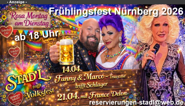 EVENT Tipp: Das Nürnberger Frühlingsfest findet vom 04. bis 26. April 2026 auf dem Volksfestplatz am Dutzendteich (Bayernstr. 100) statt. Das Nürnberger Volksfest feiert 200 Jahre Jubiläum, darum drei Wochen im Frühjahr statt zwei! Dafür sind die Montage Ruhetage. Übrigens, das Stadl’l ist wieder dabei, diesmal am Haupteingang (ehem. Franken-dorf)! Statt Montag heißt es dieses Jahr gleich 2 x „Rosa Montag am Dienstag“! Die LGBTIQ*-Community & Friends freuen sich, dass am Dienstag den 14. April 2026 um 18:00 Uhr „Rosa Montag am Dienstag“ im Stad‘l steigt. DJs sorgen für Stimmungsbeats und Marco & Fanny begeistern mit ihrer „Travestie trifft Schlager-Show“. Die zweite Ausgabe folgt am Dienstag 21. April 2026 um 18:00 Uhr wieder mit DJ-Beats und der legendären France Delon mit Travestie, Charme und einer Show voller Witz und Unterhaltung. Wir freuen uns auf zahlreiche fesche Trachtenmänner & Trachtenmädels, die bunt und fröhlich feiern. Tische können reserviert werden (ab 6 Personen) per Mail an das Stad‘l.