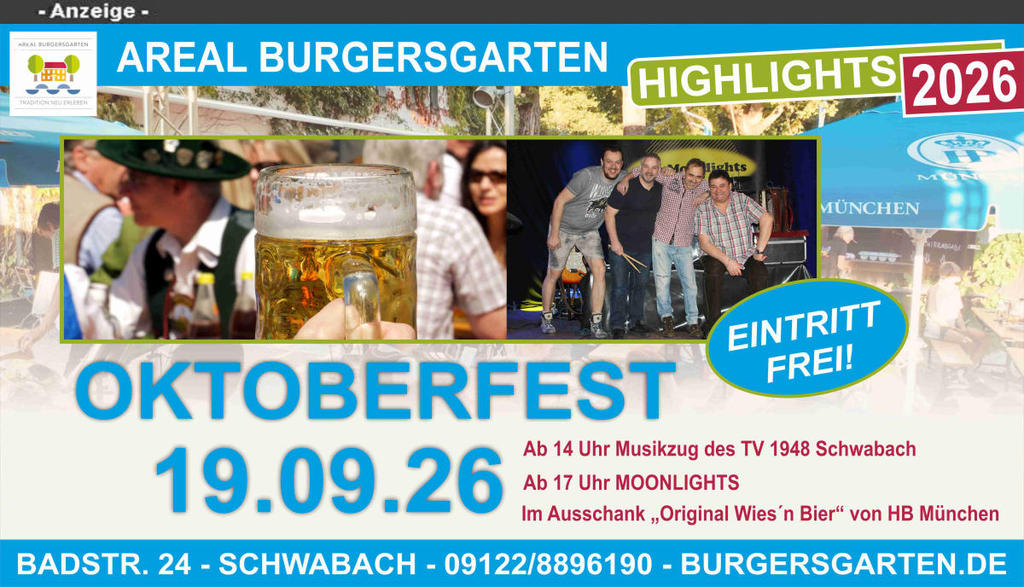 Schwabach: Zwei Schläge und ein Sicherheitsschlag, und das Freibier quoll in die Bierkrüge. Am zweiten April-Samstag eröffnete Wirt Holger Stark mit seinem Team bei mild-sonnigem Frühlingswetter offiziell die Biergarten-Saison vom Areal Burgersgarten Schwabach (Badstr. 24). Um kurz nach 17:00 Uhr marschierte die „Stadtkapelle Spalt“ mit Holger, Team, sowie Gästen in den vollbesetzten Biergarten ein. Nach kurzer Ansprache stand das originale alte Holzfass im Mittelpunkt der Aufmerksamkeit: Bezirkstags-präsident Peter Daniel Forster hat das hölzerne Bierfass fast spritzfrei angestochen. Er bekam kurz vorher noch ein paar Insider Tipps von Roland Keuschnigg vom Staatlichen Hofbräuhaus in München. Außerdem hatte er sich über YouTube Videos etwas schlau gemacht, wie er uns verraten hat. „Ein herzliches Dankeschön gilt Peter Daniel Forster, Bezirkstagspräsident, sowie Karl Freller, Landtagsabgeordneter und Vizepräsident des Bayerischen Landtags a. D., und Wolfram Göll, Bürgermeister von Kammerstein“, so Wirt Holger Stark.... +++ Hier geht´s zum vollständigen Bericht mit Bildergalerie auf der DOKU-Seite +++