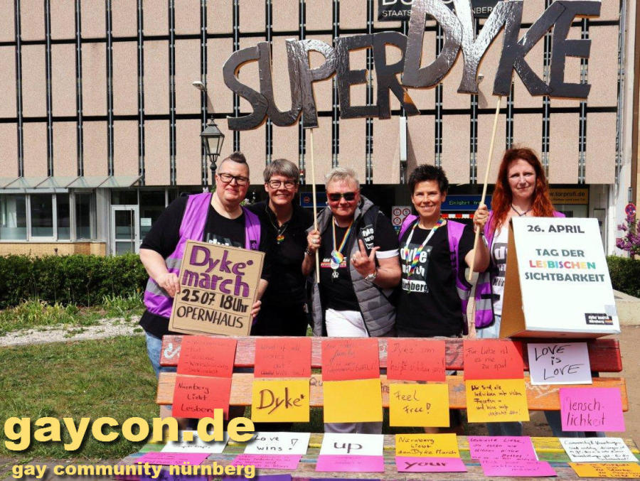 Das OrgaTeam vom Dyke*March Nürnberg organisierte zum „Internationalen Tag der lesbischen Sichtbarkeit“ (Lesbian Visibility Day) am vierten April-Sonntag zum sechsten Mal eine Aktion in der Altstadt. Treffpunkt war traditionell der Community Gedenkort am Magnus-Hirschfeld-Platz beim Nürnberger Sterntor. Über 70 Teilnehmende sind dem Aufruf heuer bei warmem Frühlingswetter mit Sonnenschein gefolgt. Als Mitmachaktion sollten positive Botschaften auf großformatige Karten geschrieben werden, welche in den Farben der lesbischen Flagge auf der Regenbogenbank vorbereitet lagen. Nach der Redezeit konnten die Karten beschrieben und nach Abschluss der Aktion die eigene Karte mit nach Hause genommen werden. Beispiele: „Für Liebe ist es nie zu spät“; „Love is Love“; „Nürnberg liebt… Lesben“; „Dyke* sein ist meine Super Kraft!“; „Mich nicht mehr erklären müssen!“; „Offen lesbisch zu leben bedeutet, zu mir zu stehen und authentisch zu leben“; „Ja – zu Vielfalt, zu mir, zu Stärke, zu Anerkennung, zu LIEBE“. Neben der offiziellen Begrüßung durch das dyke*march OrgaTeam sprachen Andrea Kuhn (Internationales Filmfest der Menschenrechte) und Babs (dyke*march Team).... +++ Hier geht's zum vollständigen Bericht mit Bildergalerien vom Magnus-Hirschfeld-Platz und Schafkopfturnier auf der DOKU-Seite +++