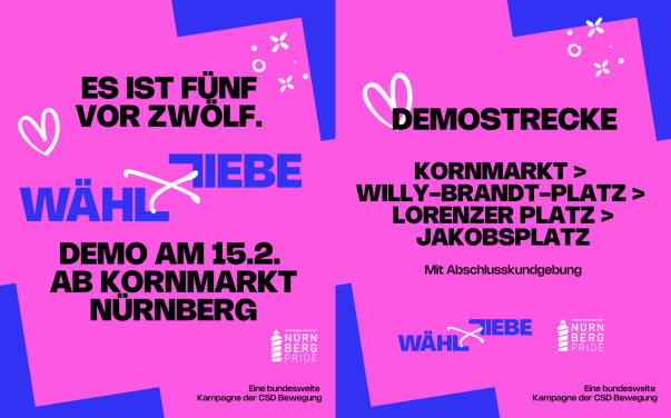 Premiere: Mehr als 50 deutsche CSDs starten im Januar erstmals die gemeinsame Kampagne „Wähl Liebe – Kreuze setzen statt Grenzen“ zur vorgezogenen Neuwahl des 21. Deutschen Bundestages am 23. Februar 2025. Ihre Botschaft: „Liebe ist stärker als Hass!“ Mit dieser Kampagne sollen besonders (Nicht-) Wählende für die Rechte der queeren Community sensibilisiert und ermutigt werden, Parteien zu wählen, die „für Vielfalt, Toleranz und Gleichberechtigung eintreten“, vor allem überhaupt wählen zu gehen. Außerdem gibt es dazu einen bundesweiten Aktionstag am Samstag den 15. Februar 2025 um 11:55 Uhr. Unter dem Stichwort „5 vor 12“ sind über 40 Demonstrationen vorgesehen. Berlin plant gleich einen Winter-CSD als besondere Aktion an diesen Tag. Neben den großen Städten wie Köln, Hamburg und München ist auch unsere Region dabei. Die organisierende CSD Gemeinschaft wünscht sich eine große Straßenpräsenz der LGBTIQ*-Community zu diesem speziellen Aktionstag. Konkret stellen die deutschen CSD Vereine im Rahmen der Kampagne drei zentrale Forderungen auf: Dass auch queere Menschen den vollen Schutz des Grundgesetzes erhalten. Dass die finanzielle Absicherung der queeren Beratungs- und Communitystrukturen durch den Staat erfolgt sowie ein besserer Schutz vor Hasskriminalität und Hatespeech.