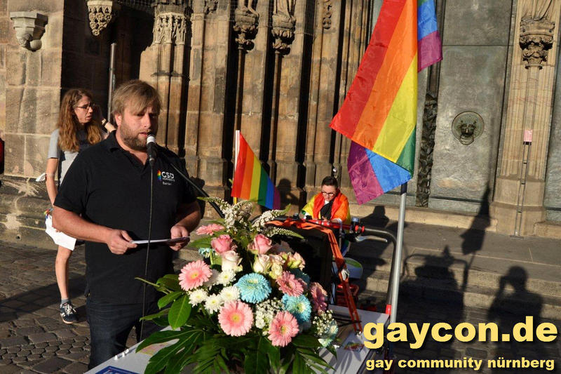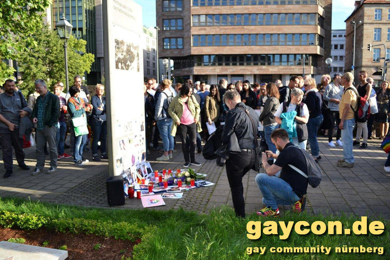 Am Mittwochabend gedachten an der Stele am Nürnberger Sterntor rund 150 Menschen der Opfer des Massakers von Orlando. Die Veranstaltung wurde kurzfristig organisiert vom Bündnis gegen Trans- und Homophobie, um Solidarität mit den kaltblütig Ermordeten und ihren Angehörigen zu bekunden. Michael Glas (Fliederlich) nannte zum Gedenken die Namen der 49 Toten. Deren Bilder wurden an der Stele mit Kerzen als „Symbol des Lichts gegen Hass und Homophobie“ drapiert. Nürnbergs Bürgermeister Christian Vogel (SPD) unterbrach für das Gedenken einen weiteren Termin, weil es ihm ein wichtiges Anliegen war, sowohl persönlich als auch repräsentativ für die Stadt des Friedens und der Menschenrechte zu sprechen: „Es ist schlimm zu sehen, wie 49 Menschen ihr Leben lassen mussten, weil der Täter einen Hass gegen Homosexuelle hatte. So etwas darf sich nicht wiederholen. Die Liebe kann man nicht vorgeben. Liebe muss immer möglich sein. Das gilt für alle und jeden. Dafür gilt es zu kämpfen.“ Uschi Unsinn bedankte sich für das Medieninteresse und für die zahlreiche Anteilnahme. Mit einer Schweigeminute und einem Gebet von Sylvia Jühne, Dekanatsbeauftragte für Homosexualität und Kirche, wurde die Veranstaltung beendet. Hintergrund: Die Welt ist erschüttert über das Massaker im Club Pulse in Orlando/USA vom zweiten Juni-Wochenende. In dem beliebten Treffpunkt schwuler Männer gab es 50 Tote und 53 Schwerverletzte. In allen sozialen Netzwerken wird um die Opfer getrauert. Zahlreiche Künstler, Prominente und Politiker können die Tat ebenfalls nicht fassen. Es ist ein Angriff auf die Freiheit, nicht nur auf unsere Lebensweise in der weltweiten LGBTI Community. Es stehen noch zahlreiche CSD-Demonstrationen bevor und wir müssen erkennen, wie wichtig und notwendig diese Veranstaltungen heute noch sind. Die Community will und muss Präsenz auf den Straßen zeigen.