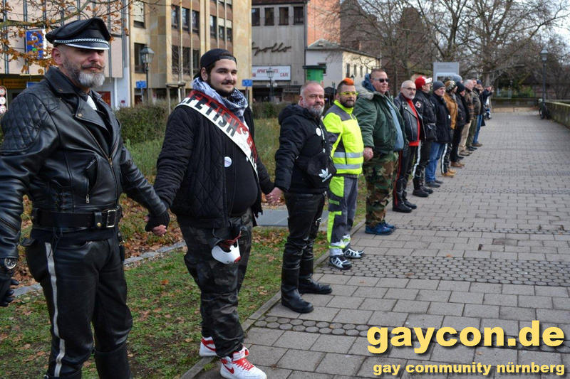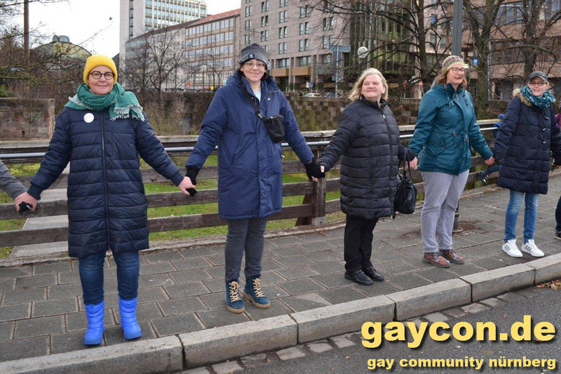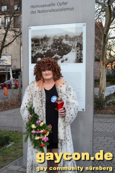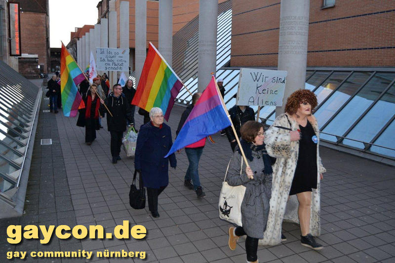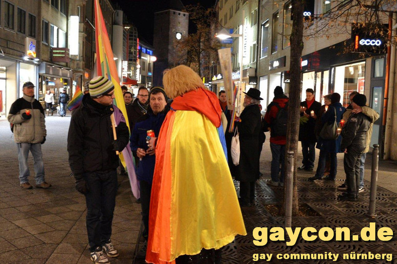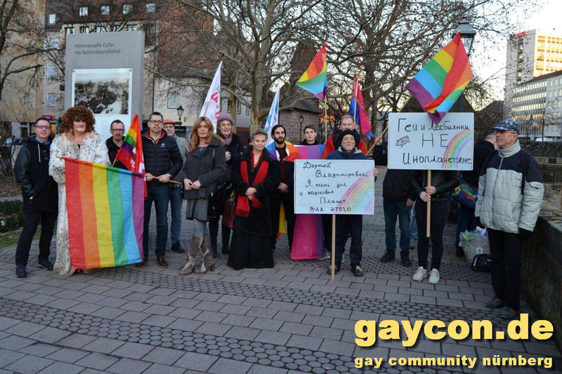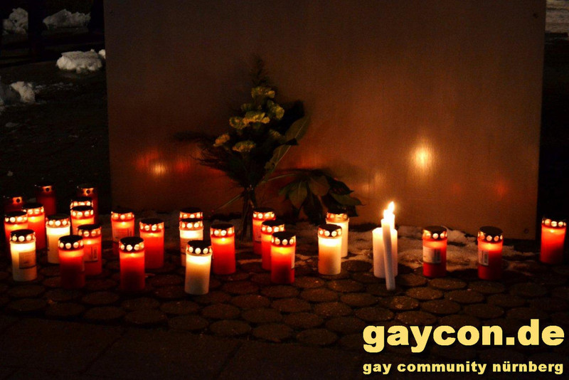 Das Bündnis gegen Trans- und Homophobie organisierte am dritten Februar-Freitag eine Gedenkveranstaltung mit Demonstration durch die Nürnberger Innenstadt unter dem Motto „Aufmerksam machen auf die Verfolgung queerer Menschen weltweit“. Rund zwei Dutzend Teilnehmer aus der Community zogen mit Regenbogenfahnen durch die Altstadt und zeigten Präsenz auf den Straßen der Stadt der Menschenrechte. An der Gedenkstele für die homosexuellen Opfer des Nazi-Regimes am Sterntor erinnerte Szeneaktivistin Uschi Unsinn am Beispiel von Tschetschenien und dem Flüchtlingslager Kakuma in Nairobi (Kenia) an die Verfolgung queerer Menschen weltweit. Seit Dezember wurden in Tschetschenien wieder etwa vierzig schwule Männer verhaftet. Zwei der Inhaftierten sind zu Tode gekommen. Schon im Dezember 2017 gab es im Flüchtlingslager Kakuma / Kenia gehäuft Übergriffe auf queere Menschen mit Schnitt- und Stichverletzungen oder blutig geschlagenen Gesichtern. Nach einer Gedenkminute und Blumenniederlegung mit symbolischer Kerze für die Opfer, zog die Demonstration am Opernhaus vorbei durch die Straße der Menschenrechte und anschließend weiter bis zum Plärrer. Am Ziel wurde der Bericht über die Schwulenverfolgung in Tschetschenien 2016 der OSZE (Organisation für Sicherheit und Zusammenarbeit in Europa) und ein Aufruf an den russischen Präsidenten Putin in den Briefkasten des Honorarkonsulats der Russischen Föderation am Plärrer eingeworfen.