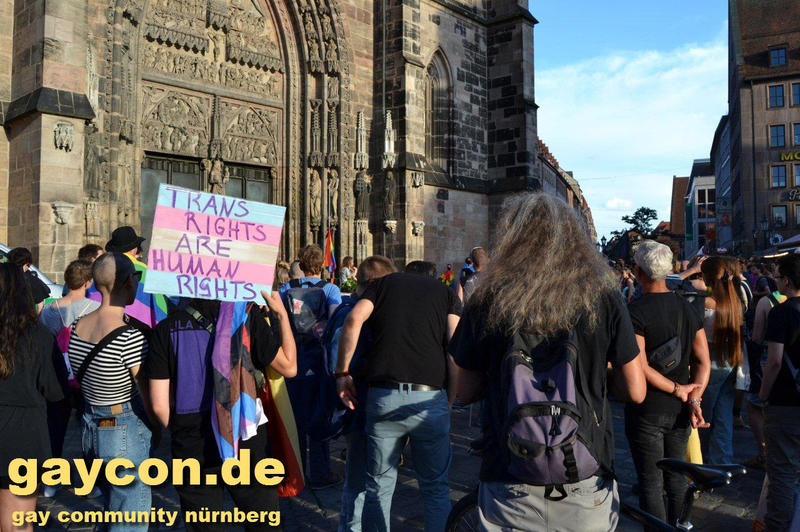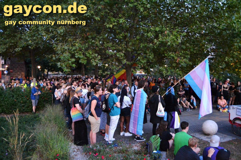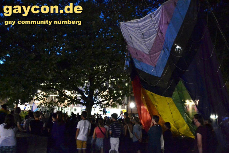 Bei einer sehr kurzfristig organisierten Demo mit Kundgebung des CSD Nürnberg am ersten September-Dienstag zogen rund 500 Teilnehmende durch die Fußgängerzone. Los ging es ab der Lorenzkirche, über Weißer Turm, Kornmarkt zum Community Gedenkort Magnus-Hirschfeld-Platz. Grund war der queerfeindliche Angriff auf den Transmann Malte, der wegen seiner Zivilcourage am Rande des CSD Münster selbst Opfer wurde und nun am ersten September-Freitag seinen schweren Sturz-Verletzungen erlegen ist. Zahlreiche Rede-Beiträge, u.a. von Josephine Taucher (Trans-Ident e.V.), Bastian Brauwer (CSD Nürnberg), Verena Osgyan (Bündnis90/ Grüne, MdL), Lukas (Jugendinitiative Fliederlich), Klaus-Dieter Röse (Die Linke), Luca Fabièn-Dotzler (Bündnis90/ Grüne) wurden ergänzt durch viele spontane Bekundungen. Sie ließen mit Worten ihrer Wut, der Trauer und dem Protest freien Lauf. Die gigantische Regenbogenfahne sorgte am Weißen Turm bei der Zwischenkundgebung auf dem Boden ausgebreitet für eindrucksvolle Sichtbarkeit. Neben zahlreichen Fahnen waren auch Schilder der Teilnehmenden wie „Rest in Power Malte“ oder „Trans Rights are Human Rights“ zu sehen, dazu skandierte die Menge „Solidarität überall – Malte war kein Einzelfall“ beim Marsch durch die Stadt. Gleichzeitig erinnerte man an die zahlreichen aktuellen Übergriffe auf queere Menschen in anderen Städten: Karlsruhe, Augsburg, Berlin, Zürich, Bamberg, Darmstadt, Stuttgart, Dortmund, Bremen, Oslo. Der CSD Nürnberg hatte die Demo für 30 Personen angemeldet gehabt und gehofft, dass trotz der Kurzfristigkeit 50 erscheinen würden. Das ist in etwa die Zahl, welche Vereine, Politik und Aktivisten bei regelmäßigen Demos und Gedenktagen wie dem IDAHOBIT, außerhalb des CSDs, aus einem harten Kern in Nürnberg zusammenbringen. Dass daraus in diesem Fall 500 geworden sind, ist zwar beeindruckend. Dennoch ist es schade, dass 90 Prozent der Menschen sich erst dann zu mehr Sichtbarkeit und Protest aufraffen, wenn die Tragödie schon passiert ist.