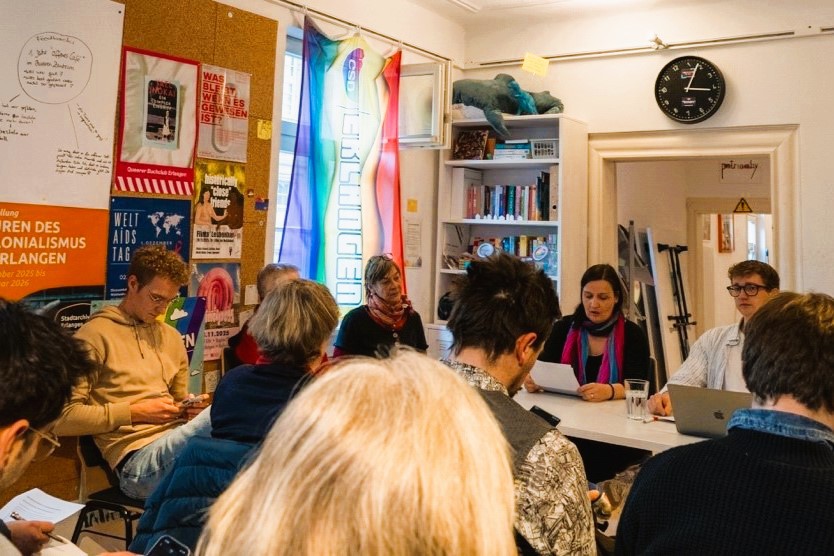 Pressekonferenz im Queeren Zentrum Erlangen: Ohne Mehrheit für den Haushaltsentwurf ist u.a. das Queere Zentrum Erlangen bedroht (Foto: Sophie Schneider – #MYTQ e.V.)