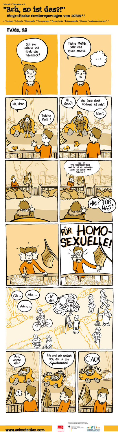 Unter dem Motto „Ach, so ist das?!“ sammelt die Künstlerin wahre Geschichten um Lebensweise und Erfahrungen von Lesben, Schwulen, Bisexuellen, Transidenten, Transgender und Intersexuellen (LSBTI) und macht daraus biografische Comicreportagen. Das Ziel ist, LSBTI-Personen in all ihren Facetten sichtbar zu machen, ihre Lebensweise, ihre Identität, aber auch Diskriminierungserfahrungen zu zeigen. Der Startschuß fiel vor über einem Jahr. Schradi saß mit ihrer besten Freundin im Café und sie erzählten sich Anekdoten aus dem Freundeskreis. „Dann hatten wir die Idee: Warum nicht daraus ein Comic machen? Deshalb meldete ich meine Projektidee beim Bundesprogramm ‚Toleranz fördern – Kompetenz stärken‘ im Bundesministerium für Familie, Senioren, Frauen und Jugend an“, erzählt sie. Stolz darüber, dass erstmals ein LSBTI-Projekt die Förderung erhält. „Auch ohne Zusage hätte ich dieses Comicprojekt umgesetzt. Nebenbei hätte es allerdings wesentlich länger gedauert .“ Martina Schradi arbeitet als Grafik Designerin und Illustratorin. Neben Beiträgen für Fliederlich e.V. oder den Frauenball Nürnberg hat sie z.B. das Logo der Tinnitussis entworfen. Auch Aufträge für die Stadt Nürnberg gehören zu ihrem Berufsalltag. „Schon in der Schulzeit habe ich gern die Ottifanten nachgemalt. Speziell an Cartoons fasziniert mich, dass sie die Aussage auf den Punkt bringen“, erzählt Schradi. „Ursprünglich hatte ich Psychologie studiert, aber genau das hilft mir jetzt bei der biografischen Arbeit.“ Ihre Freizeit verbringt sie mit ihrer Partnerin oder mit ihren besten Freundinnen im gemeinsamen Schrebergarten.