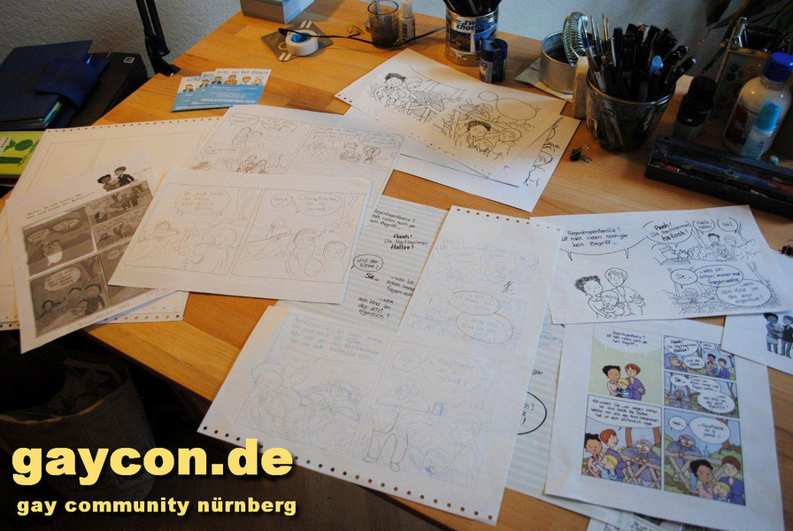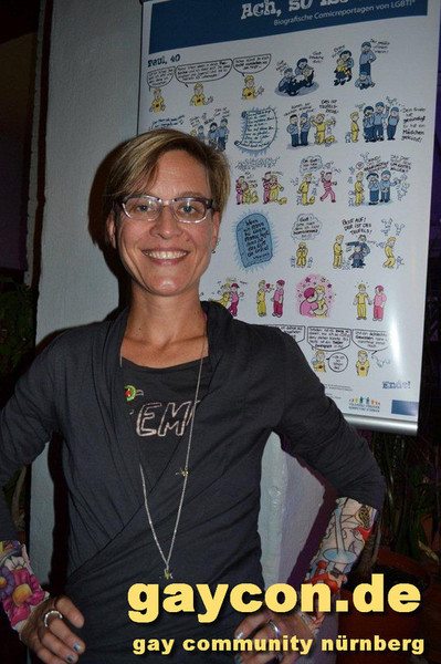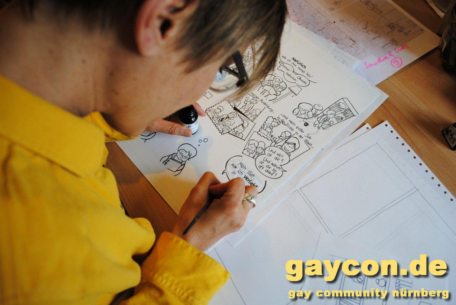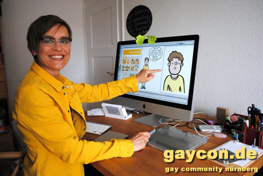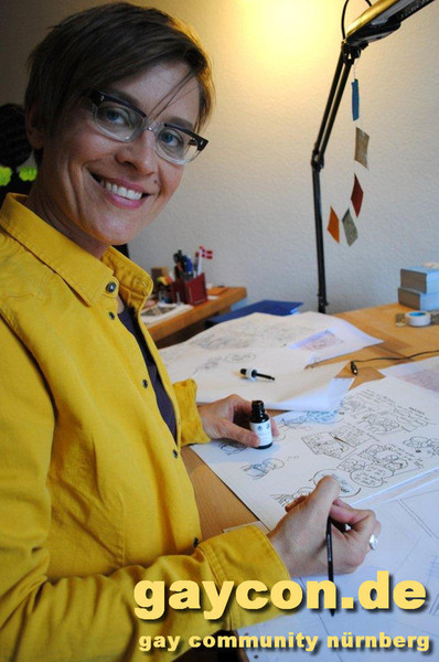 Die lesbische Aktivistin Kasha Jacqueline Nabagesera wird für ihren Kampf um mehr LSBTI-Rechte in ihrem Land Uganda/Afrika mit dem Nürnberger Menschenrechtspreis 2013 ausgezeichnet. Im Rahmenprogramm der Preisverleihung im kommenden Herbst gibt es eine Reihe interessanter Aktionen. So etwa die Friedenstafel in der Straße der Menschenrechte, einen Empfang der schwul-lesbischen Gruppierungen, eine internationale Konferenz unter dem Motto „LSBTI-Rechte sind Menschenrechte – überall“. Als außergewöhnliches Highlight präsentiert sich die Comicrelease-Party des LSBTI-Projekts „Ach, so ist das?!“ am 21.09.2013 im Stadtteilzentrum DESI. Dazu ist eine Ausstellung der Comicposter im Eckstein, sowie in den Schaufenstern mehrerer Läden in der Innenstadt geplant. GAYCON besuchte die Comiczeichnerin Martina Schradi an ihrem Zeichentisch in der Nürnberger Altstadt.