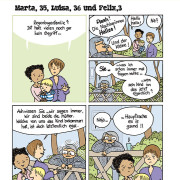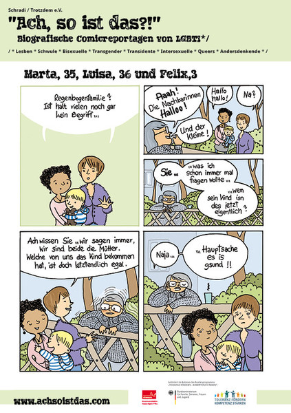 Vom ersten Kontakt mit der Erzählperson bis zum fertigen Comic durchläuft die jeweilige Geschichte einen komplexen Prozess. „Die Drähte liefen schon heiß und begeisterte Leute aus ganz Deutschland meldeten sich auf erste Pressemitteilungen per E-Mail. Ich habe viel telefoniert und im Nürnberger Raum auch einige zu persönlichen Gesprächen getroffen“, beschreibt sie das Echo. „Toll finde ich auch die individuelle Vielfalt der unterschiedlichen Lebensweisen. Das möchte ich gerne mit meinen Bildgeschichten wiedergeben.“ Zuerst fällt die Entscheidung, ob sich das geschilderte Erlebnis für einen Comic überhaupt eignet. „Das Schwierigste ist, die Dramaturgie der Story sinnvoll in Postergröße oder auf drei DIN A4 Seiten zu bekommen. Die Kunst ist, dabei authentisch an der Erzählung zu bleiben“, betont Schradi die Herausforderung. „Unser Schwerpunkt ist die neutrale Darstellung von dem Erlebnis. Dann die Reaktion der Umwelt und wie gehe ich damit um.“ Manchmal ähneln die Figuren den Erzählenden, wenn diese damit einverstanden sind. Dann wird die Geschichte in Tusche gezeichnet, gescannt und am Computer ausgemalt. „Der große Vorteil am Medium Comic ist, dass es die Leute auf einer niederschwelligen Art lockt, sich die Bilder anzuschauen. So können ernste Themen trotzdem mit Humor transportiert werden“, ist Schradi von ihrem Projekt überzeugt. Ein ganzes Team hilft ihr beim Schreiben der Geschichten, bei Ausstellungen, Events oder bei der Veröffentlichung auf der Homepage. Künftig soll auch pädagogisches Material dazu entwickelt werden. Dann können Schulen einen Satz der Comicposter gegen Unkostenbeteiligung kaufen. Übrigens, die Geschichtensammlung geht weiter! Meldet Euch unter: www.achsoistdas.com