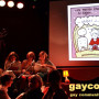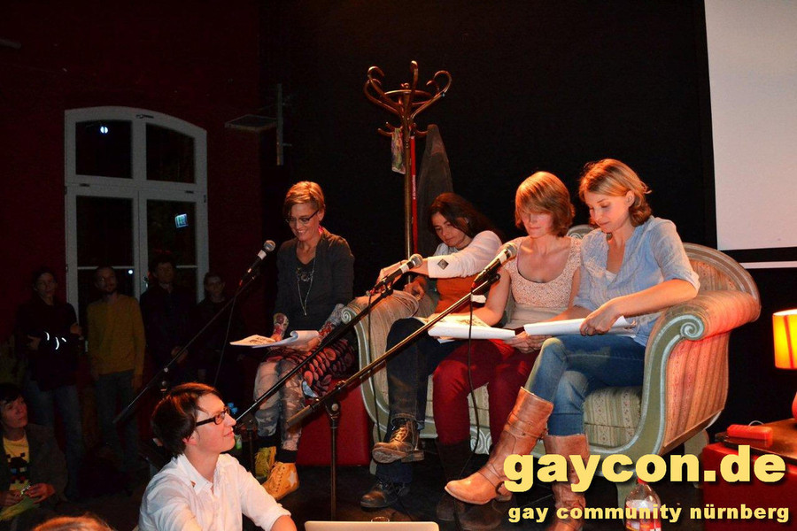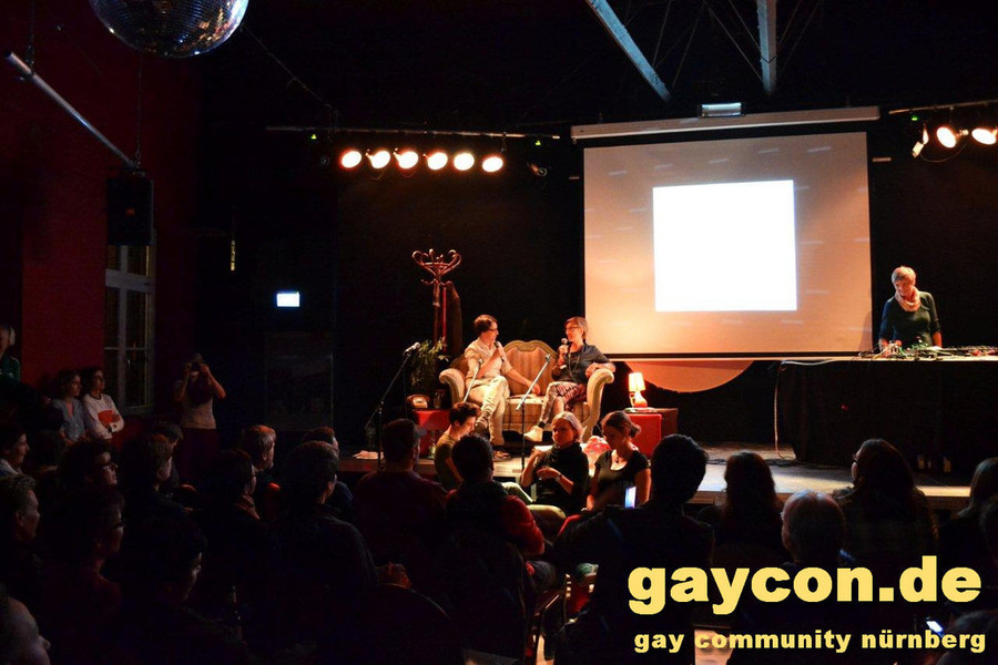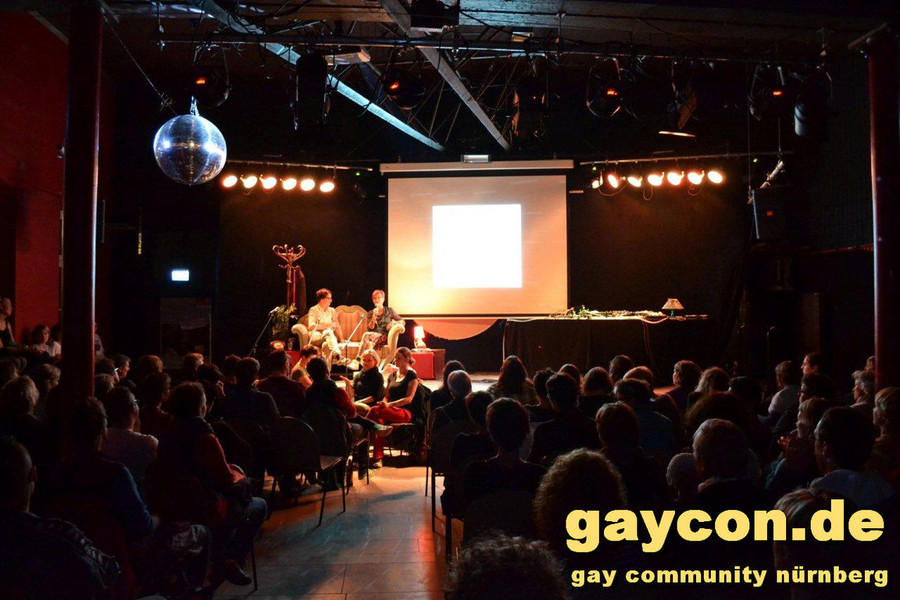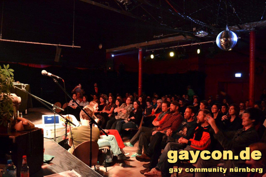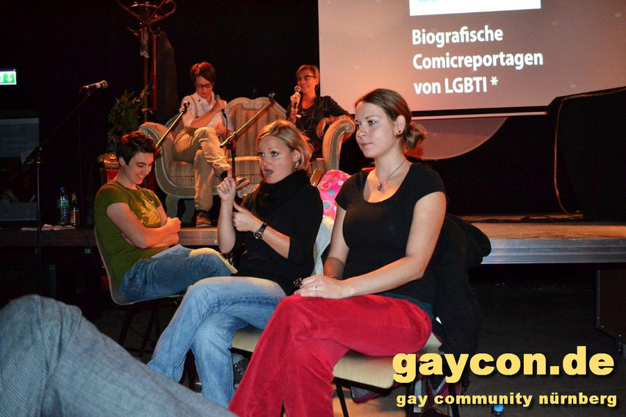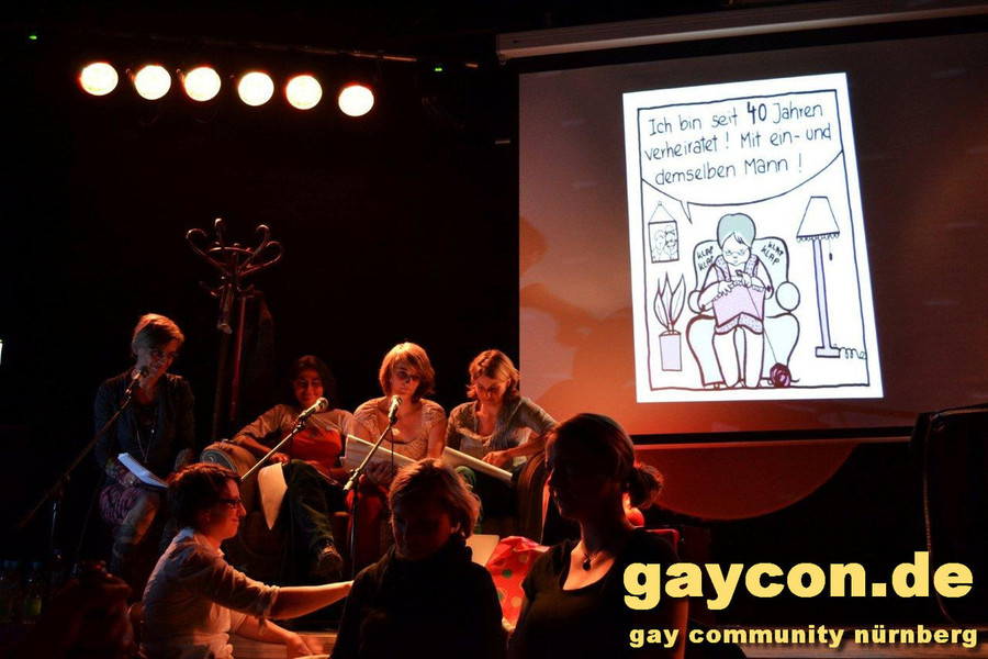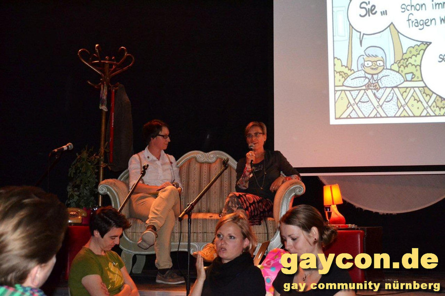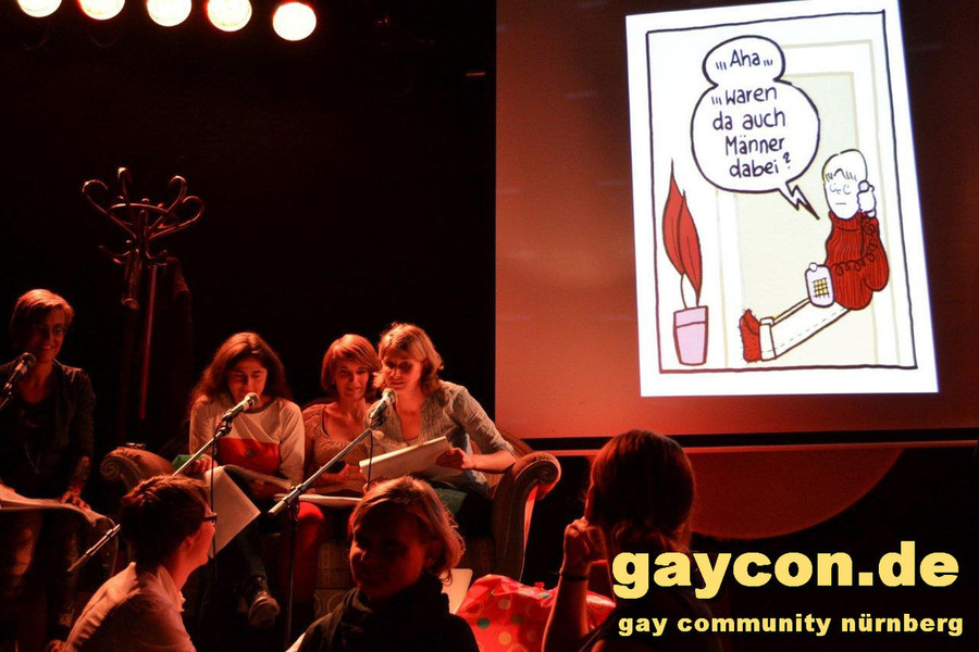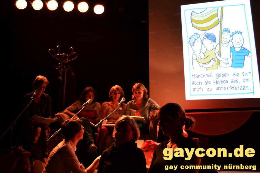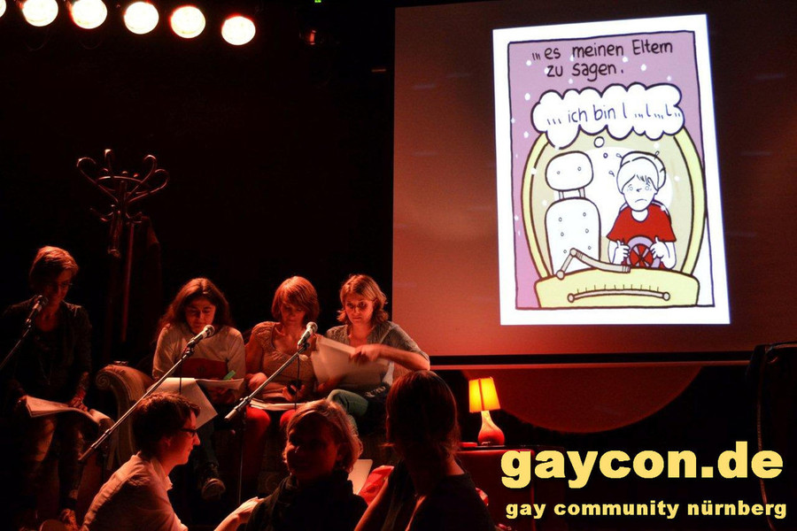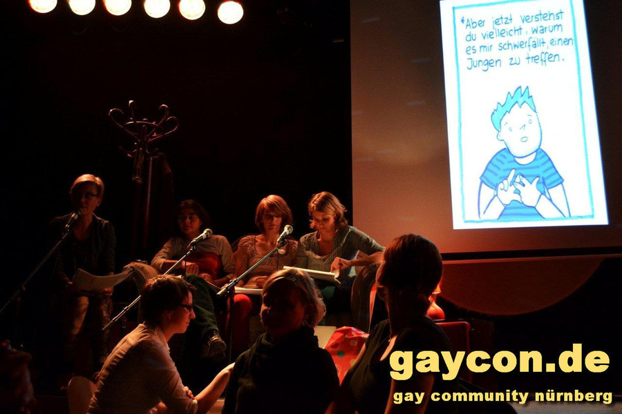In einer liebenswürdigen Multivisionsshow stellten Martina Schradi und ihr Team eine bunte Auswahl ihrer „Ach, so ist das?!“- Geschichten in der DESI vor. Eine erfreulich große Publikumsschar honorierte die gewitzt vertonten Dialoge mit viel Applaus und Zugabe-Forderungen. Bereits fünf weitere Städte buchten inzwischen die Ausstellung, die in Nürnberg ab sofort im Eckstein in der Burgstraße 1 – 3 bewundert werden kann. Die Finissage findet am 18. Oktober um 19.00 Uhr statt. Das Projekt der ‚Biografischen Comicreportagen von LGBTI’ wird gefördert im Rahmen des Bundesprogramms „Toleranz fördern – Kompetenz stärken“.