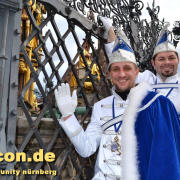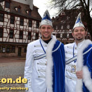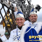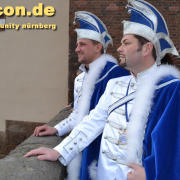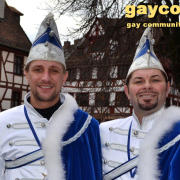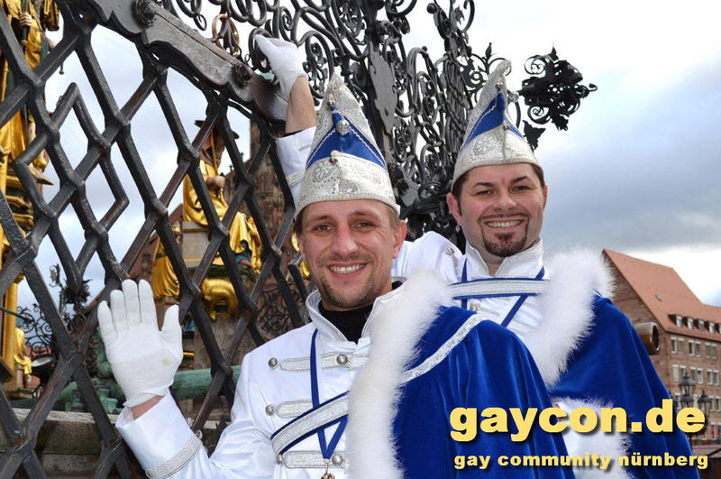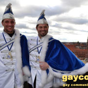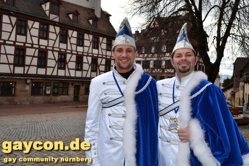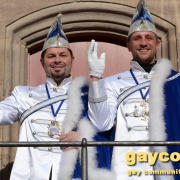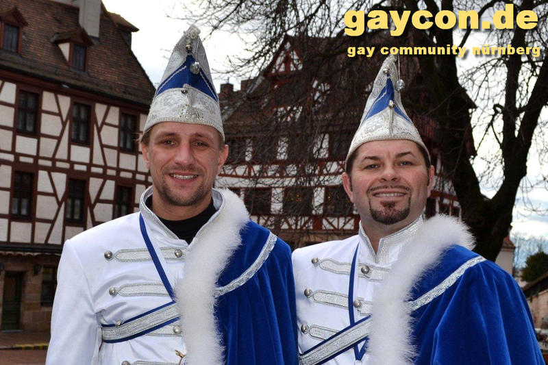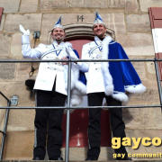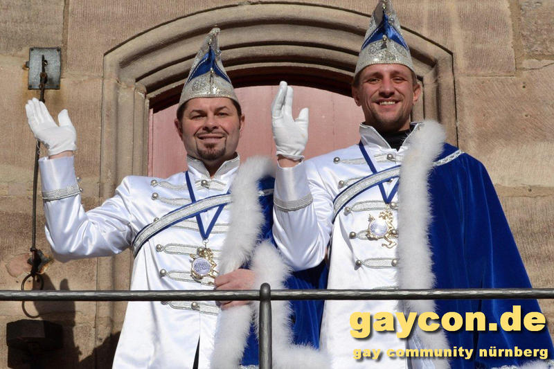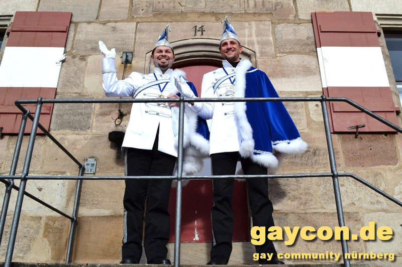 „Nach dem Rathaus-Sturm in Küps und dem medialen Echo haben wir bemerkt, dass wir anständige Kostüme wegen der Optik und gegen Regen und Kälte brauchten. Bisher waren wir nur in Jeans und weißem Hemd unterwegs gewesen“, beschreibt Gerald die Vereinshürde. „Ich wusste, es sollte kaiserlich aussehen. Wie beim Kaiser Franz oder Graf Andrzej in den Sissi-Filmen und in den Farben blau/weiß des Faschingsvereins. Die Kosten der Schneiderin hat schließlich eine bekannte Heimatbäckerei gesponsert.“ Beim 44. Oberfränkischen Prinzentreffen des Fastnachtsverbands Franken in Stadtsteinach waren Gerald und Dirk bereits Anfang Januar 2015 dabei. Wobei die beiden wörtlich genommen das einzige echte ‚Prinzenpaar‘ waren, eine Prinzessin kommt in der Bezeichnung kurioser Weise nie vor. „Alle Faschingsgesellschaften kannten uns schon als ‚Berühmtheiten aus der Presse‘. Zum Walzertanz baten wir die Frauen der Vorstände, das können wir nicht gemeinsam, weil wir uns in der Tanzführung nicht einig wären“, betont Gerald. „Nur ein Tanzmotiv mussten wir stellen. Die Fotografen wollten ein tanzendes schwules Prinzenpaar ablichten“. Gerne wären Gerald und Dirk am 15. Februar auch zum Nürnberger Faschingsumzug gekommen, aber just am selben Tag zieht auch im oberfränkischen Oberlangenstadt der eigene Gaudiwurm ab 13:33 Uhr durch den Ort. Da gibt’s die Prinzen live zu sehen. Natürlich ein Pflichttermin für den sympathischen Faschingsadel.
