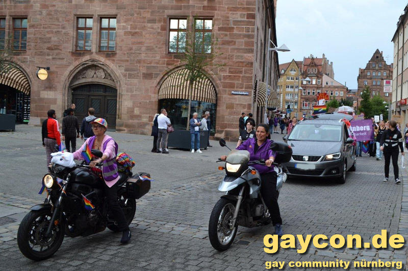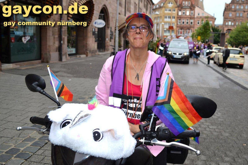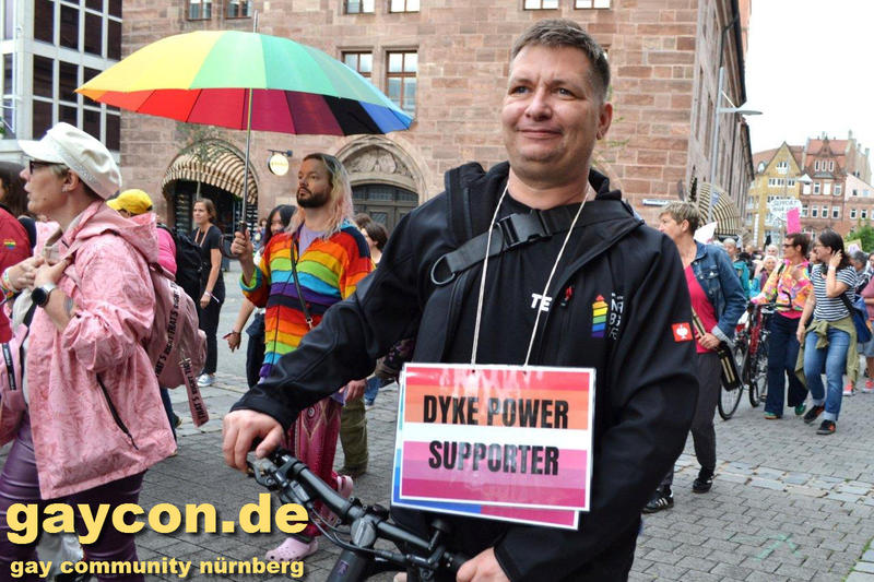Die inzwischen genehmigte Demo Route startet am dritten August um 18:00 Uhr direkt vor dem Opernhaus. Nach einem kurzen Stück auf dem Frauentorgraben biegen sie am Sterntor in die Grasersgasse ab, auf direktem Weg in die Altstadt. Beim Kornmarkt wird es einen kurzen Abstecher in die Straße der Menschenrechte geben. Danach geht es über die Dr.-Kurt-Schumacher-Straße zum Jakobsplatz. Von dort gibt es einen Schwenk zum Weißen Turm in die Fußgängerzone. Über die Karolinenstraße geht es zur Lorenzkirche, dort endet der Marsch. Angeführt wird die Demo von „Dykes on Bikes“, allerdings nur bis zum Jakobsplatz, weil in der Fußgängerzone nicht gefahren werden darf. „Als eine einzige große Gruppe, als loser Zusammenschluss, wird bei der Demo gelaufen. Selbstverständlich können sich die Teilnehmerinnen dabei als ihre eigene (Stammtisch-) Gruppe erkennbar zeigen, aber es ist keine Anmeldung wie bei der CSD-Demo nötig. Wir rechnen mit hundert bis zweihundert Frauen“, meint Sandra. „Wünschen würde ich mir vierhundert Dykes. Das wäre eine tolle Größe“, wirft selbstbewusst Conny ein. „Wir sind die Strecke abgelaufen und haben die daran liegenden Geschäfte informiert. Die Idee stammte vom Vernetzungstreffen im Frühjahr. Wir haben zu 85 Prozent positive Erfahrungen erlebt. Alle fanden das toll, und waren überrascht, weil sie noch nie zuvor bei einer geplanten Demo vorher informiert wurden“, berichtet das Orga-Team. „Wir werden auch als Sisterhood Fußgruppe zusammen mit den Dykes on Bikes bei der CSD-Nürnberg-Demo mitmachen. Es ist schön, dass der Kontakt mit dem Nürnberger CSD Förderverein richtig gut klappt. Zum dyke*march sind alle aufgerufen, die sich als Lesben* definieren und solidarisch sehen. Gerne können sich die Teilnehmerinnen aktiv und kreativ an der Demonstration beteiligen, sei es mit Transparenten, Musikinstrumenten, Kostümen oder was ihnen sonst noch so einfällt. Wir wünschen uns eine laute und bunte Demo und eine Nürnberger Innenstadt voll mit fröhlich feiernden Lesben und ihren Freund*innen“. Und, natürlich freuen sich die Dykes* über das Zujubeln und Anfeuern von Menschen jedweden Geschlechts* und Alters. Das Selbstverständnis der Gendervielfalt, die über die üblichen Geschlechterrollen männlich und weiblich hinausgeht, bringen die Organisatorinnen übrigens nicht nur bei dem Wort dyke*march, sondern grundsätzlich mit einem Sternchen bei der Personenbezeichnung zum Ausdruck.