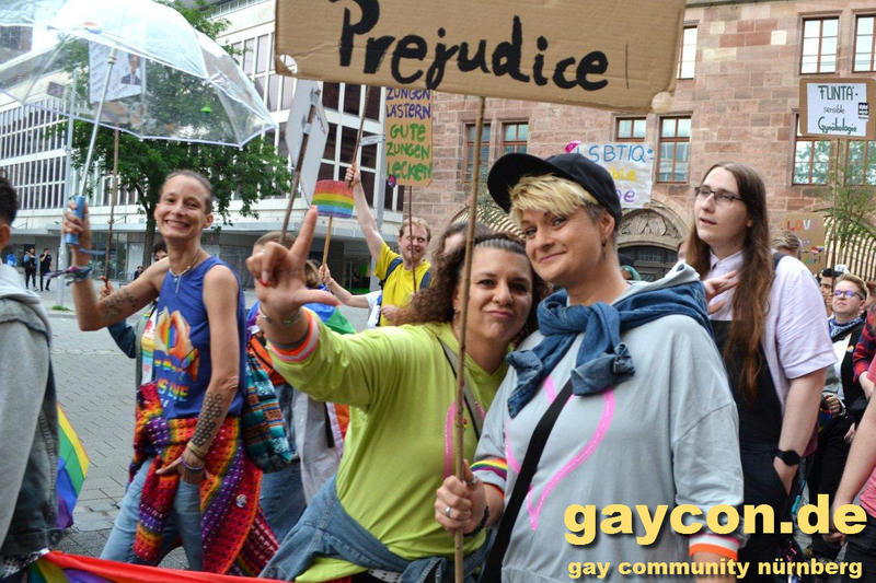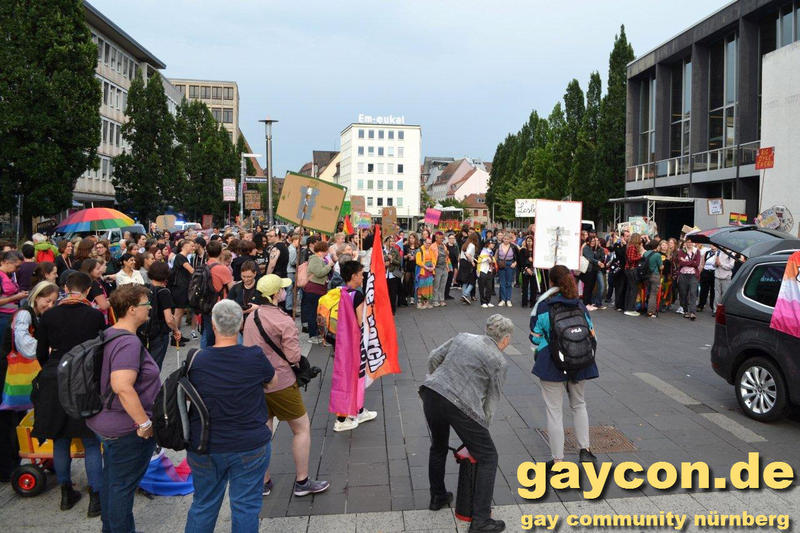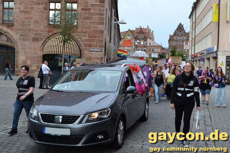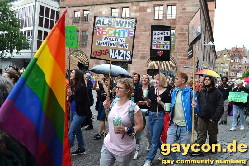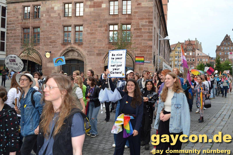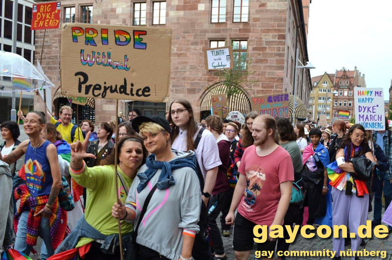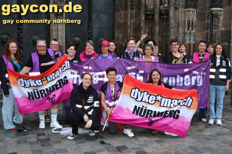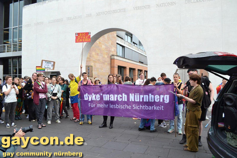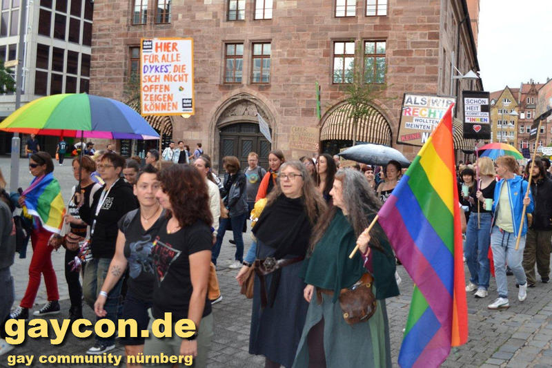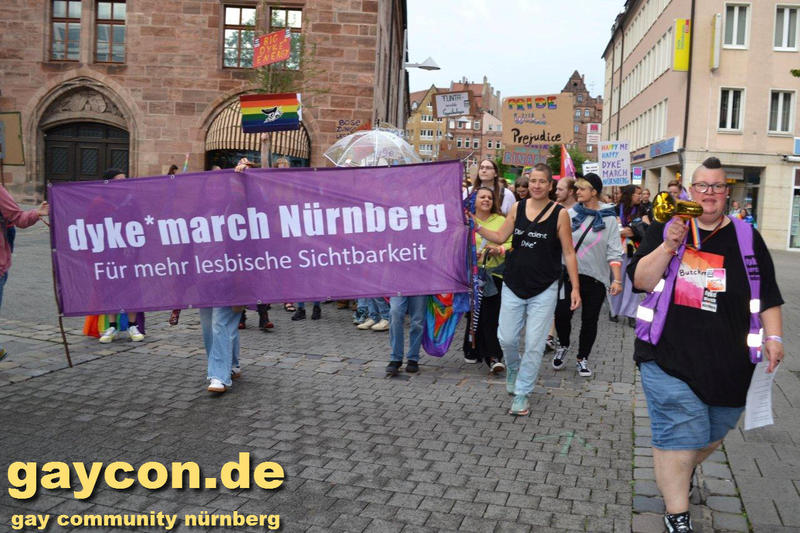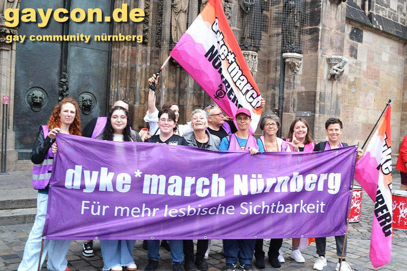 „Hallo Nürnberg! Wir sind’s, deine Lesben“ schallte der Schlachtruf zur Sichtbarkeit laut aus den Boxen durch die City, und alle jubelten! Rund 350 Lesben* und Unterstützende zogen am vierten Juli-Samstag beim siebten dyke*march Nürnberg für mehr lesbische Sichtbarkeit durch die Straßen der Frankenmetropole. Unter dem diesjährigen Motto „Lesben* vereint gegen Rechts!“ Diesmal an einem Samstag und nicht wie in den letzten Jahren am Freitag vor der CSD Nürnberg Demo. Diese Entscheidung ist ein Experiment des OrgaTeams gewesen, in der Hoffnung, mehr Dyke*s an einem Samstag auf die Straßen zu bringen als an einem Freitag. Außerdem hatten sie unglaubliches Wetterglück. Nur Stunden zuvor durchzog heftiger Starkregen Teile des Stadtgebiets, aber der City-Bereich blieb verschont. Nur vereinzelt tröpfelte es vom Himmel, als die bunte Menschenschar, angeführt von zwei „Dyke*s on Bikes“, nach der Auftakt-Kundgebung am Opernhaus zuerst zum Bahnhofsplatz zog. Danach in die Altstadt, durch die Fußgängerzone Königstraße. An der Mauthalle marschierten alle über den Hallplatz zum Kornmarkt. Dort legte der Dyke*March einen kurzen Stopp ein, für die Zwischenkundgebung vor dem Tor zur Straße der Menschenrechte. Wegen einer großen Baustelle am Ludwigsplatz musste die gewohnte Route gekürzt werden. Über die Dr.-Kurt-Schumacher-Straße ging es in die Färberstraße, weiter zur Fußgängerzone Karolinenstraße. Direkt vor dem Eingangsportal der Lorenzkirche fand die Abschlusskundgebung statt. Viele bunte kreative Schilder, Schirmen und Regenbogen- sowie Dyke-Flaggen sorgten für ordentliche Aufmerksamkeit bei den Passanten. Redebeiträge gab es unter anderem von Christine Burmann, Beauftragte für Diskriminierungsfragen und LSBTI der Stadt Nürnberg, sowie jeweils sehr persönlich emotionale von Leo und von Babs. Im Anschluss ging‘s dann zur „After dyke*march – FLINTA*-Bar & DJ Night im Club Stereo. Inzwischen ist die 7. Dyke*March Nürnberg Bildergalerie online. +++