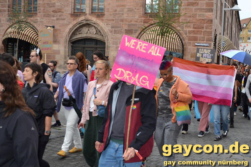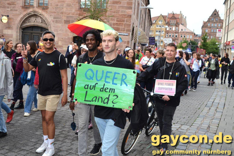 Wir wünschen uns natürlich, dass alle wiederkommen, die letztes Jahr dabei waren, und dass noch viele neue Teilnehmer*innen dazukommen, um mit zu demonstrieren und mitzufeiern. Schön wäre es, wenn sich noch mehr mit Regenbogenfahnen, Kostümen und Schildern ausstatten würden. Wer nicht alleine basteln mag, ist herzlich zum Schilder-Bastel-Workshop „Plakativ zur Demo“ am 21.7. eingeladen. (Nähere Infos im CSD-Programmheft oder unter kontakt@dykemarch-nuernberg.de) Der zweite dyke*march Nürnberg soll noch größer, noch bunter, noch lauter, noch sichtbarer werden!