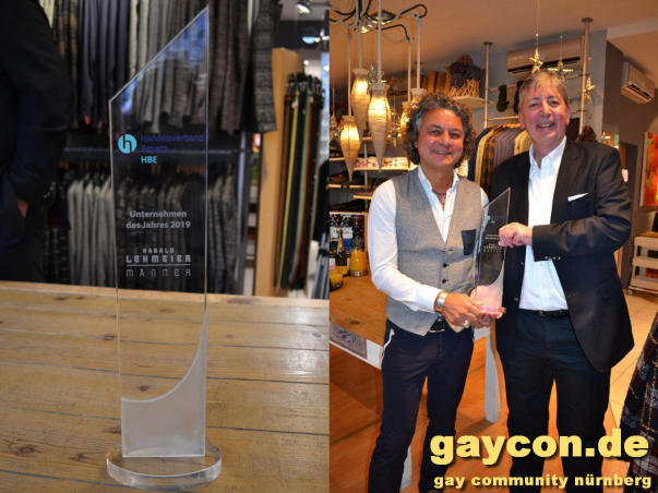 GAYCON gratuliert: Am vierten November-Mittwoch wurde Harald Lehmeiers Fachgeschäft für Männermode als Unternehmen des Jahres 2019 ausgezeichnet! Der Handelsverband Bayern (HBE), Bezirk Mittelfranken, zeichnet alljährlich Einzelhandelsunternehmen aus, die sich in der Branche besonders durch Innovationskraft und Kreativität hervorheben. Aus den Händen von HBE Bezirksgeschäftsführer Uwe H. Werner bekam Lehmeier die große Glasskulptur überreicht. „Es ist die Krönung meiner textilen Laufbahn. Ich hab mich extrem gefreut. Es ist auch eine Auszeichnung für mein Lebensweg“, freut sich Harald, der schon vor fünf Jahren als einziger Männermode-Unternehmer zum „Meisterhändler“ vom Verein Erlebnis Nürnberg ernannt wurde. „Bevor ich vor ein paar Wochen den Anruf bekam, wusste ich überhaupt nicht, dass es so eine Auszeichnung gibt.“ Eine Jury forscht nach innovativen Einzelhandelsunternehmen. Anschließend werden die Kandidaten der engeren Wahl vor Ort unter die Lupe genommen. „Es ist bisher noch nicht vorgekommen, aber gerne könnten auch Kunden innovative Läden direkt beim Verband melden. Dann schauen wir uns diese genauer an“, betont Uwe H. Werner. Am Abend wurde noch im Schindlerhof in Nürnberg-Boxdorf groß gefeiert. Dort gab es neben Glückwünschen von der Stadt Nürnberg noch eine große Urkunde im Beisein von Bürgermeister Christian Vogel und Wirtschaftsreferent Dr. Michael Fraas. „Gerade die Fähigkeit des Unternehmens, sich auf veränderte Marktsituationen und Kundenwünsche einzustellen und durch permanente Anpassung und Innovation die Unternehmenszukunft zu sichern, ist nach Auffassung der Jury einen herausragende Leistung des Unternehmens im Sinne von Best Practice und beispielgebend für die Einzelhandelsbranche“, so der Wortlaut aus der Presseerklärung. GAYCON freut sich, dass mit Harald Lehmeier gleichzeitig ein Unternehmer aus der queeren Community ausgezeichnet wurde.