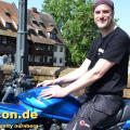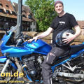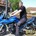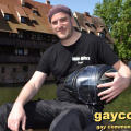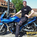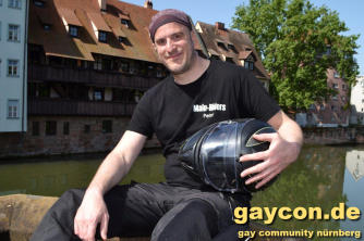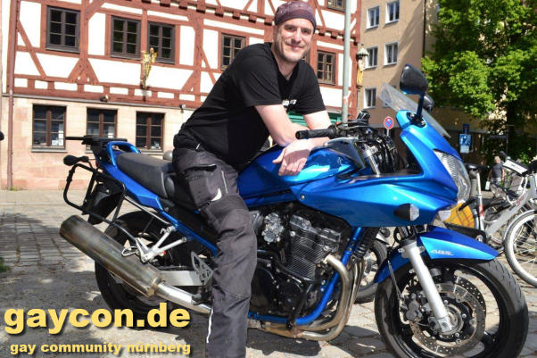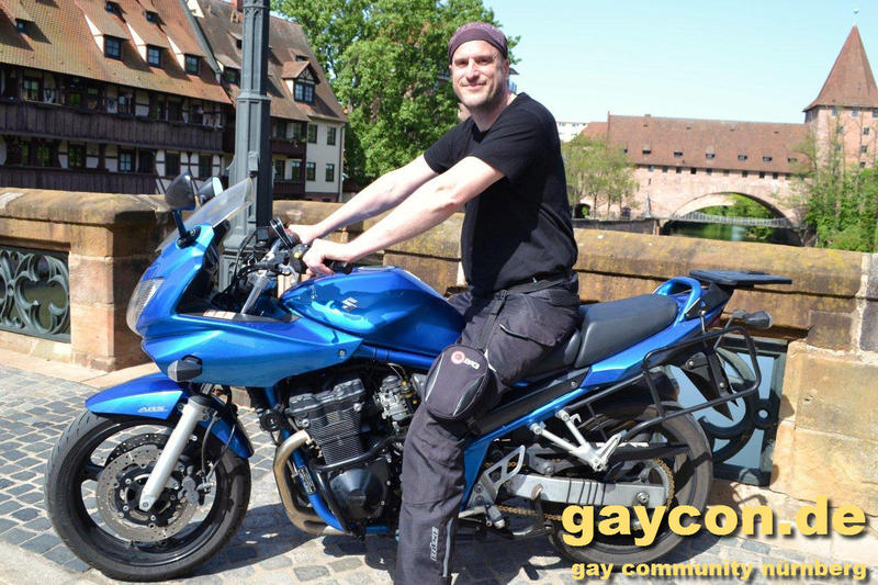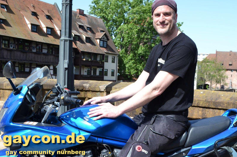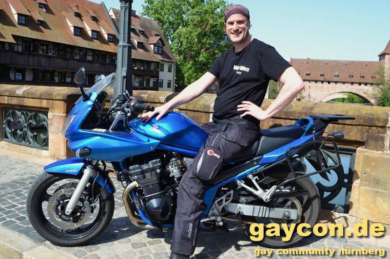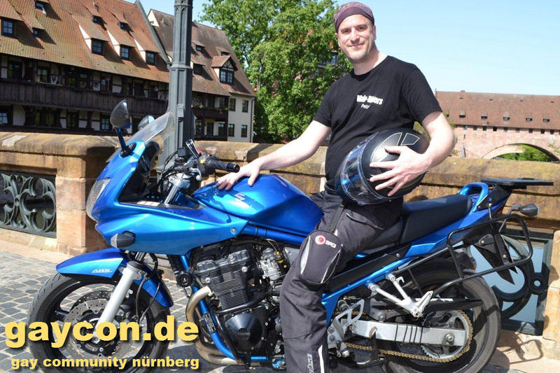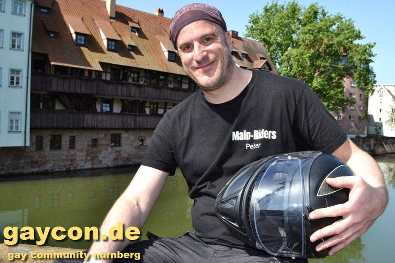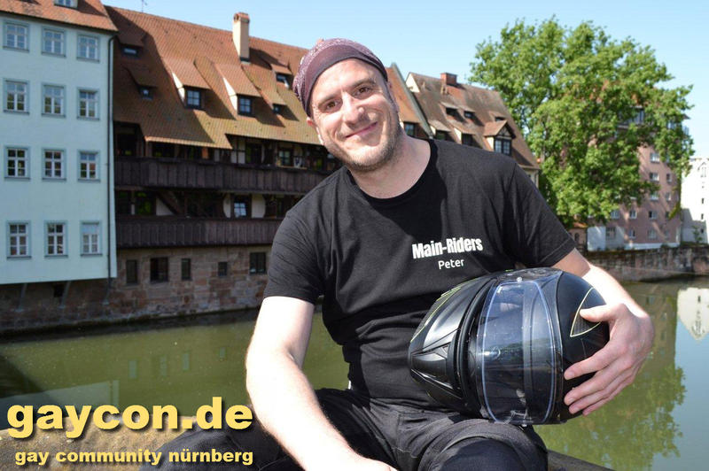 Peter Korn ist in Nürnberg geboren und aufgewachsen. Als kleines Kind wollte er Feuerwehrmann werden. Lernte dann den Beruf des Elektrikers, und baut heute Antriebsbatterien für Elektro-LKW, davor waren es Dieselmotoren, bei einem großen Unternehmen in Nürnberg. Weil sein Vater beruflich bei der Verkehrspolizei in der Motorradstaffel fuhr, privat jedoch nie, ist dem Peter die Neugier an den Maschinen quasi mit in die Wiege gelegt worden. Schon mit zwei Jahren fuhr er beim Papa auf dem Tank mit im Kreis. Ein familiärer Schicksalsschlag allerdings war, dass der Großvater beim Motorradfahren tödlich verunglückte, was Peters Sicherheitsbewusstsein beim Motorradfahren nachhaltig beeinflusst hat. „Anfangs bin ich bei verschiedenen Leuten nur mitgefahren. Beim besten Kumpel, beim Bruder und bei meinem Ex-Freund aus Köln. Erst 2011 machte ich den Motorradführerschein, sonst hätte ich ihn gar nicht mehr gemacht“, erzählt Peter. „Wichtig ist mir auch die Aktivität des Motorradfahrens in der Gruppe. Das sind keine sexuellen Kontakte. Keine Ficktreffen. Da haben so manch Außenstehende leider oft einen falschen Eindruck.“ Die Frage nach seiner eigenen sexuellen Identität hat er sich selbst mit 17 Jahren gestellt. Eigentlich hatte er sich seit seinem Coming out 24 Jahre lang als schwuler Mann gefühlt. Vor kurzem erlebte er ein neues Coming out als Bisexueller. „So wie ein Fluss, oder eine Straße, nie gerade verläuft, sondern Kurven und Bögen macht, so läuft auch das Leben nicht gerade und macht Kurven und Bögen. Mit dem Alter kommt die Weisheit“, erzählt Peter lächelnd. Seine persönliche Lieblingsgegend für Motorrad-Touren ist die Fränkische Schweiz. Er liebt es, die gemeinsamen Touren mit einem Zwischenstopp zum Mittagessen, zum Kaffeetrinken oder zum Abendessen zu verknüpfen. „Es gibt so viele schöne Ecken, so viele schöne Biergärten sowie Geheim-Tipps. Wer Stille und Abgeschiedenheit sucht, wird auch fündig“, ist Peter überzeugt. „Und ich liebe die Region Spessart. Vermutlich weil ich auch nicht so oft hinkommen kann.“ Für die Bezeichnung seiner Motorradgruppe wollte er einen besonderen Namen finden, der aber bundesweit gleichzeitig die fränkische Region wiederspiegelt. „Jede fränkische Motorradgruppe nennt sich hier irgendwie ‚Franken-Biker‘. Ich finde das einfallslos. Ich wollte einen Namen, der sich davon unterscheidet, aber womit sich alle Franken identifizieren können“, erklärt Peter, der alle großen Flüsse in die Namens-Überlegung einband. „Übrig blieb der Main, der über Franken hinaus bekannt ist, der viele Städte verbindet und der größte und längste Fluss hier ist. Außerdem liegen in Oberfranken die zwei Main-Quellen.“ Und ihm war ein neutraler Name wichtig, der nicht gleich einen sexuellen Bezug zulässt. Schließlich entschied er sich für ‚Main-Riders‘. „Jeder, der ein Motorrad hat, ist willkommen. Sofern er unsere Gruppenregeln akzeptiert, sozial und verkehrstechnisch sich zu benehmen weiß“, betont Peter. Die Main-Riders sind kein Verein, sondern eine Interessensgemeinschaft. Es gibt keine Mitgliedsbeiträge. Jeder muss sein Benzin selber bezahlen, jeder trägt seine eigenen Unkosten und seine Verantwortung.