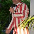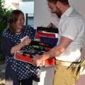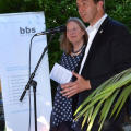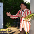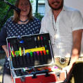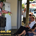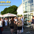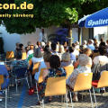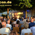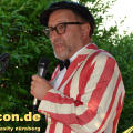 Hochsommerliche Temperaturen bei der 45. Benefiz-Aktion von Marcel Schneider im Nürnberger Stadtteil Altenfurt am zweiten Juli-Samstag, unter Schirmherrschaft von OB Maly. Statt unter tropischen Verhältnissen im Salon zu schwitzen, wurde die Veranstaltung kurzerhand auf dem Gelände des Autohauses neben dem Laden unter freiem Himmel, schattigen Bäumen und Sonnenschirmen abgehalten. Zugunsten der Frühförderung des bbs Nürnberg, Bildungszentrum für Blinde und Sehbehinderte in Langwasser, präsentierte der Opernballcoiffeur einen bunten Kabarettabend mit Wortakrobat Oliver Tissot. Mit gekonnten Wortverdrehungen und Doppeldeutungen sorgte der Nürnberger Künstler für etliche Lachsalven. Haupt-„Opfer“ des verbalen Feuerwerks war natürlich Gastgeber Marcel Schneider, doch auch Autohersteller, der G20 Gipfel, zufällige Passanten auf der Straße oder Stammkunden wurden auf die heitere Schippe genommen. Vorher brachte in einer kurzen Ansprache bbs Direktor Patrick Temmesfeld vor allem seinen Dank für Marcels unermüdlichen Einsatz zum Ausdruck. Gabriele Feigl (Leiterin Frühförderung bbs) hat spezielle Bastelkoffer für die Kinder mit Sehbehinderung vorgestellt. Diese speziell auf die Anforderung abgestimmten Materialien sollen mit dem Erlös des Abends finanziert werden. Bei Marcels Aktionen kommt der Erlös immer zu 100% dem Projekt zugute, auch Künstler verzichten auf die Gage.