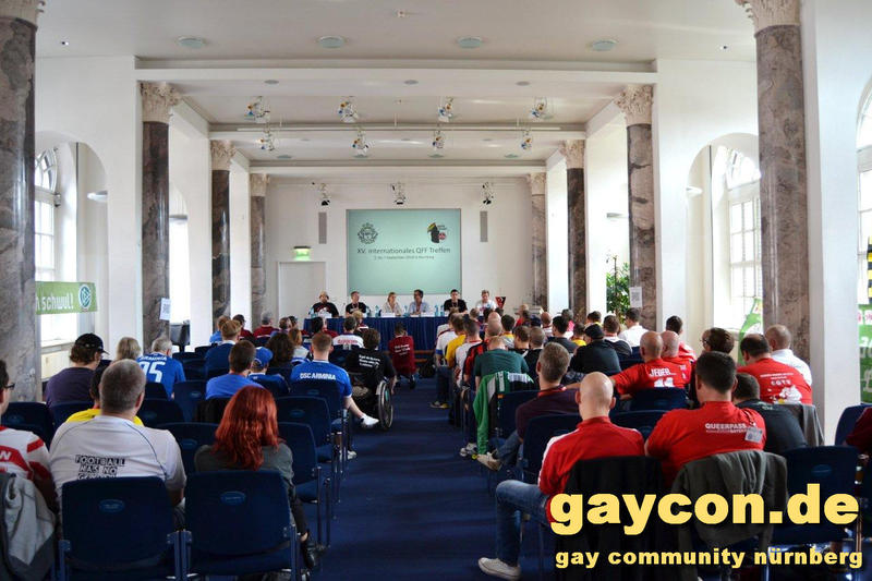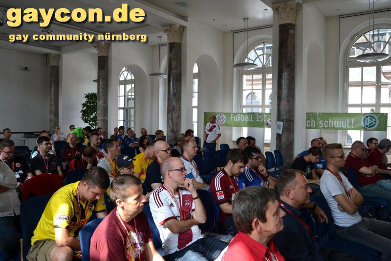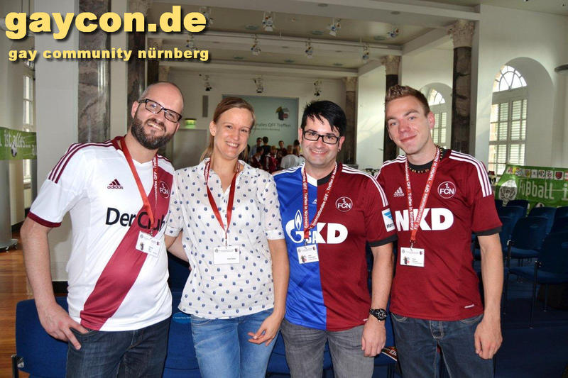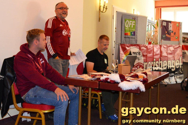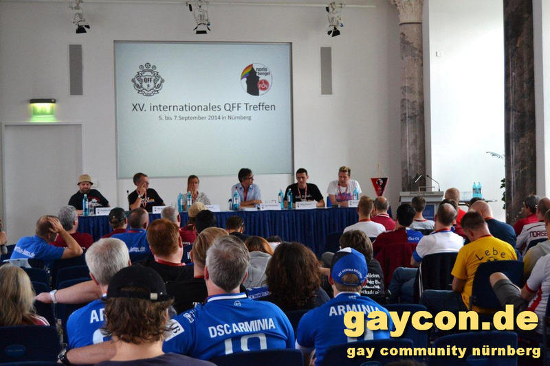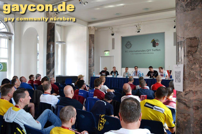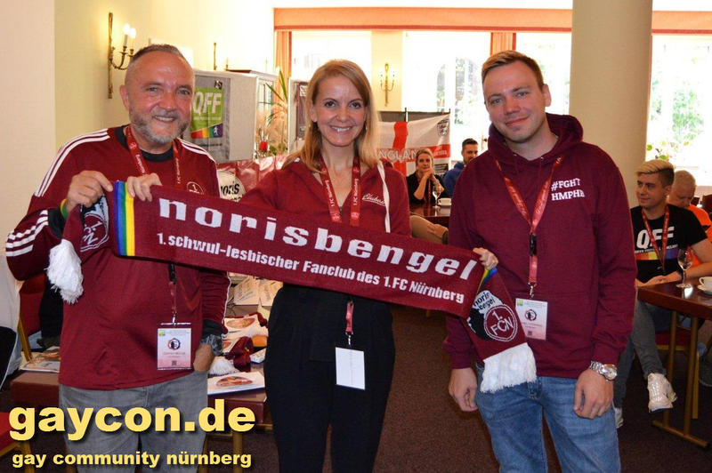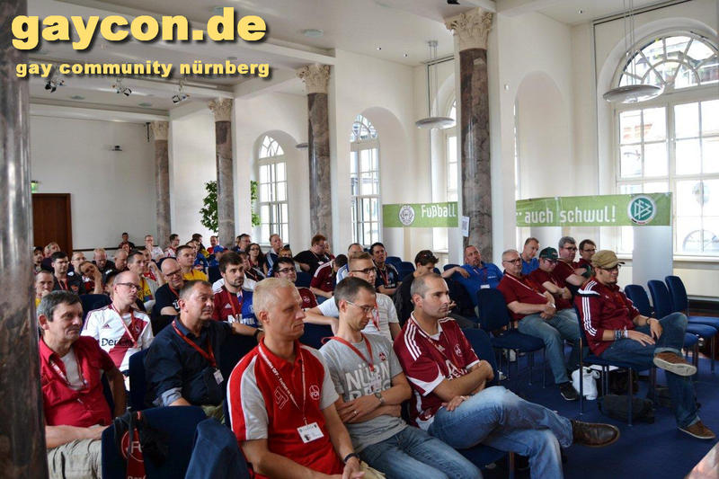 Am ersten Wochenende im September fand das 15. Internationale Queer Football Fanclub (QFF) Treffen im großen Marmorsaal des Presseclubs in der Nürnberg Akademie am Gewerbemuseumsplatz statt. Die Ausrichter, der queere Fanclub des 1.FCN „Die Norisbengel“, sorgten rund um die QFF-Tagung für ein abwechslungsreiches Rahmenprogramm im Herzen der Frankenmetropole. Dass der 1.FCN treue Fans mit enttäuschenden Leistungen vor den Kopf stößt, daran hat sich der Franke im Laufe seiner Geschichte derart abgefunden, dass er diese Liebe trotzdem nicht bereut. Doch auch seinen queeren Fanclub, die Norisbengel, blamierte der Club vor rund 100 Teilnehmern aus Deutschland und dem angrenzenden Ausland mit einer kurzfristigen Absage. Unter der Vorgabe von Termingründen schaffte es der Verein nicht, auch nur einen einzigen aktiven Spieler zur zweistündigen Podiumsdiskussion abzuordnen. Wohlgemerkt an einem spielfreien Wochenende, soll man das glauben? Umso erfreulicher, dass Lizenzspieler Ralph Gunesch (FC Ingolstadt 04, früher St. Pauli) für die Fragen der Teilnehmer aus 25 queeren Fanclubs zur Verfügung stand. Zur großen Diskussion am Samstagnachmittag fanden sich außerdem Christian Mössner vom Fanmagazin „Ya Basta!“, Dirk Brüllau Pressesprecher der Queer Football Fanclubs, Birgitt Glöckl von der dt. Akademie für Fußball Kultur, Alex Schmitt von den Supporters Nürnberg, Hannes Orth Fanbeauftragter des 1.FCN und als Moderator Jens Schadendorf, Autor von „Der Regenbogenfaktor“, auf dem Podium im Marmorsaal ein. Zu Beginn der Diskussion las Jens Schadendorf einige Kostproben aus seinem Buch „Der Regenbogenfaktor“ vor, die auch den queeren Fußball-Fanclubs gewidmet sind. Er geht auf den Ex-Nationalkeeper Jens Lehmann ein, der Bizarres von sich gab, wie „Hitzlsperger habe ‚von seiner Spielweise‘ her ‚überhaupt nicht den Anlass gegeben‘, dass man ‚hätte denken können, da ist irgendetwas‘.“ Schadendorf zitiert aber auch Meinungsbildner wie Ex-Spiegel-Kulturchef Matthias Mattusek, der sich in einem Beitrag als „homophob. Und das ist auch gut so“ outete oder auf Norbert Blüm, der einmal die Forderung erhob, dass Schwule, Lesben und andere sexuelle Minderheiten nicht die gleichen Rechte wie Heterosexuelle haben sollen.