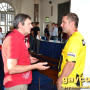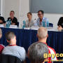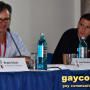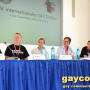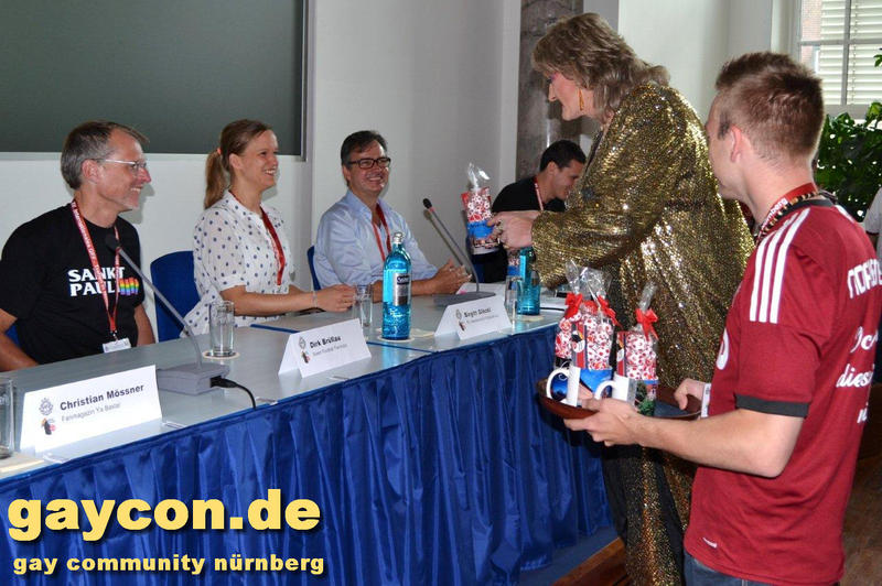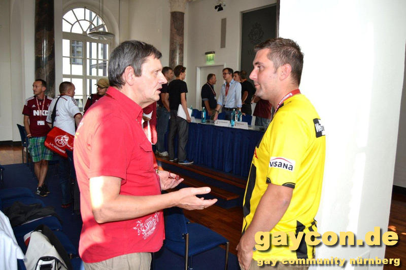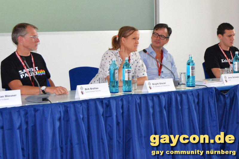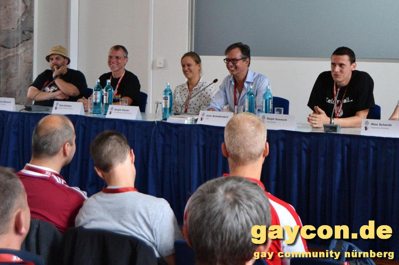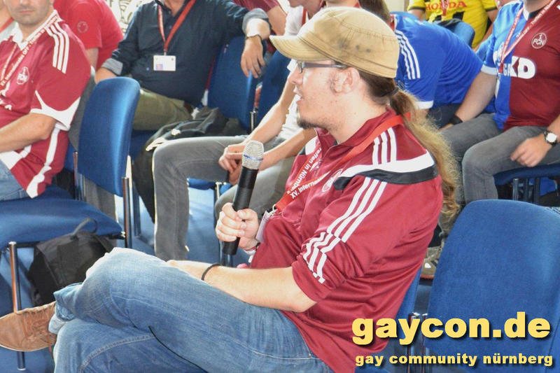 Nach der Begrüßung der Podiumsgäste entstand eine interessante Diskussion rund um das Veranstaltungsmotto. Dass das Thema Homosexualität im Sport schon lange kein Tabu mehr sei, bemerkt Birgit Glöckl. Sie findet es schade, dass die meisten Medien immer wieder damit von vorne beginnen und etliche Fanprojekte nicht wahrgenommen werden. Statt Tabu Homosexualität scheint es eher ein „Angst“-Thema zu sein. Scheinbar haben die Fußballvereine einfach nur generell Angst, mit dem Thema konfrontiert zu werden. Aber gerade hier in Nürnberg, in der Stadt der Menschenrechte, könnte sich der 1.FCN profilieren und sich erst recht mit dem Thema herausstellen, findet Christian Mössner und bezeichnet die Podiumsabsage vom Club als peinlich und beschämend. Braucht es nach dem Coming-out von Hitzelsperger weitere Bekenntnisse von aktiven Fußballspielern? Aus der Profisicht von Ralph Gunesch wäre das einerseits kein Problem, weil viele Befürworter hinter dieser Person stehen würden. Doch andererseits, wenn der Betroffene zu Hause als Privatmensch 20.000 Anfeindungen im Internet verkraften muss, steht er damit allein, weshalb Gunesch eher abraten würde. Aus seiner Sicht wäre es vermutlich erträglicher, wenn sich z.B. 15 Spieler gemeinsam outen würden. Sein Abraten sorgt für erregte gegenteilige Meinung aus dem Publikum. Eine Rednerin meint, es könne doch nicht sein, dass 40 Jahre nach dem ersten Straßenkampf für die Rechte von Schwulen und Lesben immer noch vor der Öffentlichkeit der Schwanz eingezogen wird. Die Geschichte brauche auch mutige Einzelkämpfer. Ein anderer Redner findet, dass ein auf Dauer geführtes geheimes Spieler-Doppelleben ebenfalls fatale gesundheitliche Auswirkungen hätte. Gunesch entschuldigt sich fast, weil er sich in dieses Versteckspiel-Gefühl nicht hineinversetzen kann.
