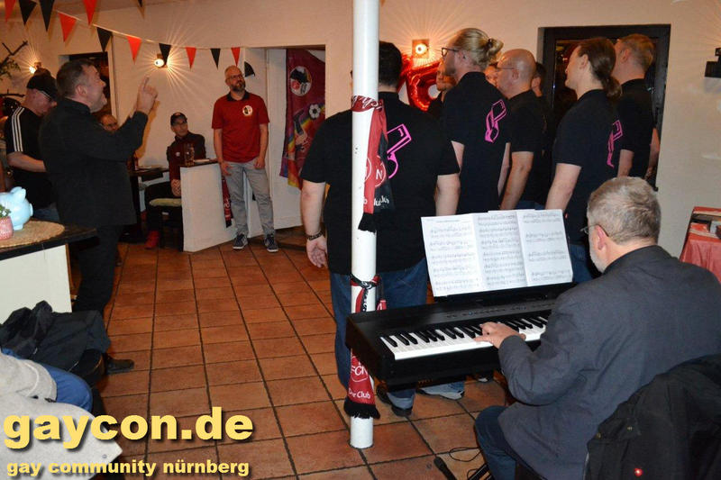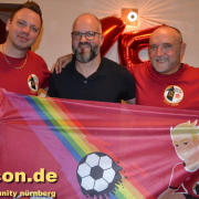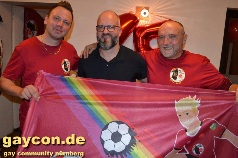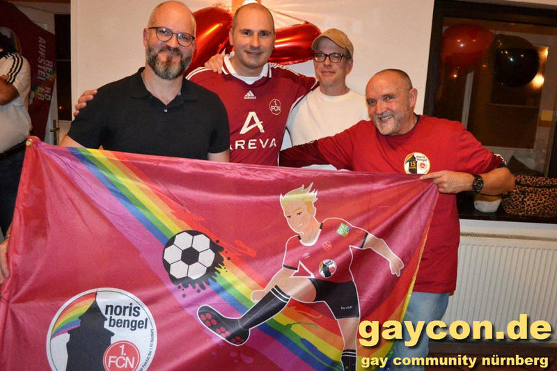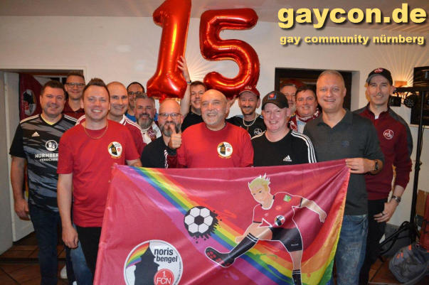 GAYCON gratuliert: zu 15 Jahren norisbengel, dem ersten offiziellen queeren Fanclub des 1.FC Nürnberg. Super Stimmung am zweiten November-Freitag bei der Vereins-Jubiläumsfeier in der KABINE-Eventlocation bei der Wöhrder Wiese, in der Nähe des Wöhrder Sees. Der schwule Männerchor, die Trällerpfeifen, sangen, als einer der Höhepunkte des Abends, für eine halbe Stunde einen Ausschnitt aus ihrem aktuellen Programm. Rund 30 Feiernde waren anwesend, außerdem schauten auch Vertretende vom Club persönlich vorbei. Ein Schlemmer-Buffet vom Estragon sowie eine Jubiläums-Torte mit norisbengel-Logo ließen niemanden hungrig. Am 06. November 2010 gründeten sie sich aus einer kleinen Gruppe engagierter Clubfans und machten den Fußball in der Region ein Stück bunter. Seit 15 Jahren stehen sie auf den Rängen, in den Kneipen und auf den Straßen für das Gleiche ein: Leidenschaft für den 1. FC Nürnberg, Respekt für alle Menschen und eine klare Haltung gegen Diskriminierung, ob auf dem Platz, im Stadion oder im Alltag. Inzwischen ist untereinander mehr als nur ein Fanclub entstanden. Freundschaft, Zusammenhalt und manchmal auch ein bisschen Familie. Ihnen ist der gemeinsame Besuch im Stadion, um den Club zu unterstützen, am wichtigsten, u.a. mit Spieltags-Aktionen. Das kann im heimischen Max-Morlock-Stadion sein, aber auch Reisen zu den Auswärtsspielen in andere Städte finden statt. Inzwischen haben sich auch vielfältige Kontakte zu anderen queeren Fanclubs entwickelt. Zum Vereinsleben gehören regelmäßige Stammtische, Ausflüge oder gemeinsame Weihnachtsfeiern. Immer wird dabei gelacht, diskutiert und natürlich der Club gefeiert, eben rot, schwarz und bunt. Aktuell haben die norisbengel 32 Mitglieder und wünschen sich mehr Nachwuchs von Seiten der jungen Generation. Gerne wären sie auch beim CSD Nürnberg mehr präsent, doch da stoßen sie ebenfalls an ihre Mitglieder-Grenzen. Wäre das nicht etwas für tatkräftig engagierte neue queere Clubfans? Schaut nach der Regenbogenflagge beim nächsten Clubspiel! Gerne könnt ihr sie direkt ansprechen. Sie freuen sich über neue Fußballfan-Gesichter. Auf die nächsten Jahre! (NK)