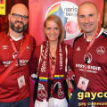 Die organisierte Fußballfankultur über Vereine gibt es nur in Deutschland, hier hat fast jeder Bundesligaverein auch einen schwul-lesbischen Fanclub. Queere ausländische Fanclubs gibt es nur in der Schweiz mit Zürich, Basel und Bern, in Spanien mit Barcelona und in Holland mit Den Haag. Bayern ist mit Nürnberg, Augsburg und gleich zweimal München gut in der QFF vertreten. Das Motto „Getrennt in den Farben – vereint in der Sache“ wird von allen queeren Fanclubs in der Praxis gelebt. „Wir Norisbengel sind sehr reisefreudig und begleiten regelmäßig unseren Club zu den Auswärtsspielen. Oft treffen wir vor oder nach dem Spiel den ortsansässigen queeren Fanclub und gehen zusammen ein Bier trinken. Die Rivalität bleibt dann draußen, so dass es ‚Heterofans‘ schon nicht mehr nachvollziehen können, wie man mit dem ‚Gegner‘ feiern kann“, lacht Steffen. „Ganz besonders verbunden sind wir mit ‚Andersrum auf Schalke‘. Sie haben uns mit einem Norisbengel-Schild direkt vom Bahnhof abgeholt. In der Stammkneipe der Kölner wurde unsere Club-Hymne gespielt.“