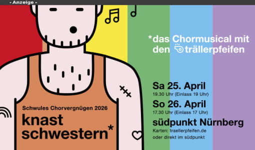 19:30 Uhr ChorprobeTrällerpfeifen - 21:30 (Außer in den Schulferien); Lust mitzusingen? Der schwule Männerchor sucht Verstärkung! Kontakt: info@traellerpfeifen.de, Stadtteilzentrum Südpunkt Nürnberg (Pillenreuther Str. 147) +++